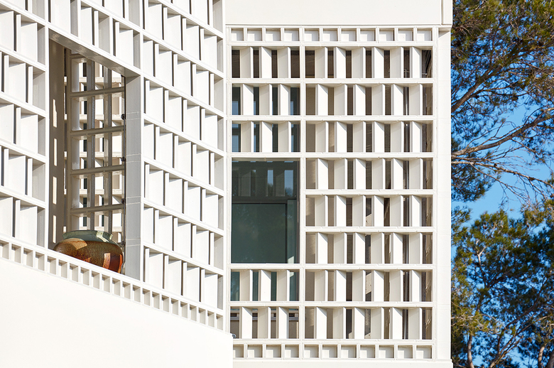Two components of prefabricated white concrete provide a frame for the latticework: the upper component crowns the green roof of the building and the lower one conceals rolling shutters that enable the house to be shut up with complete security. The ensemble is delicately poised on the building’s load-bearing structure of sandblasted in situ concrete.