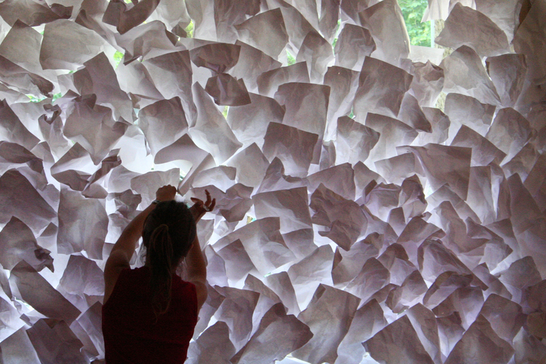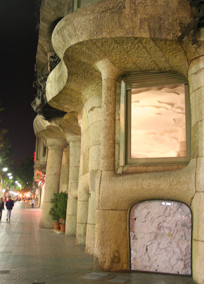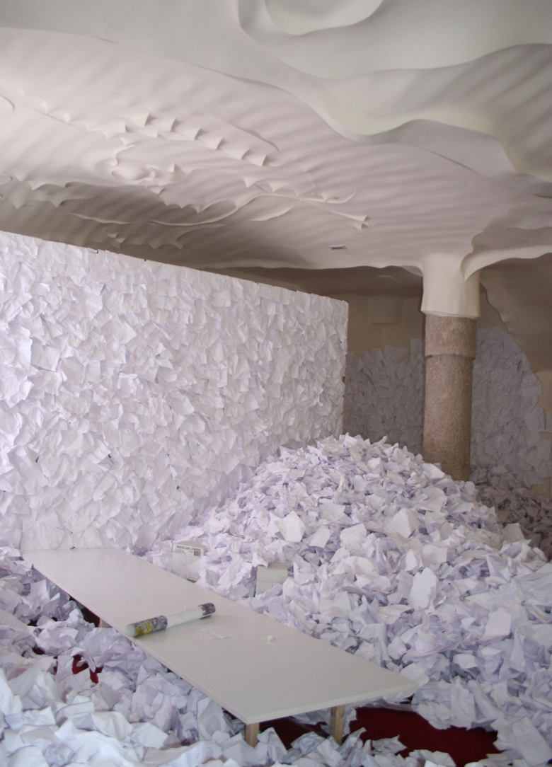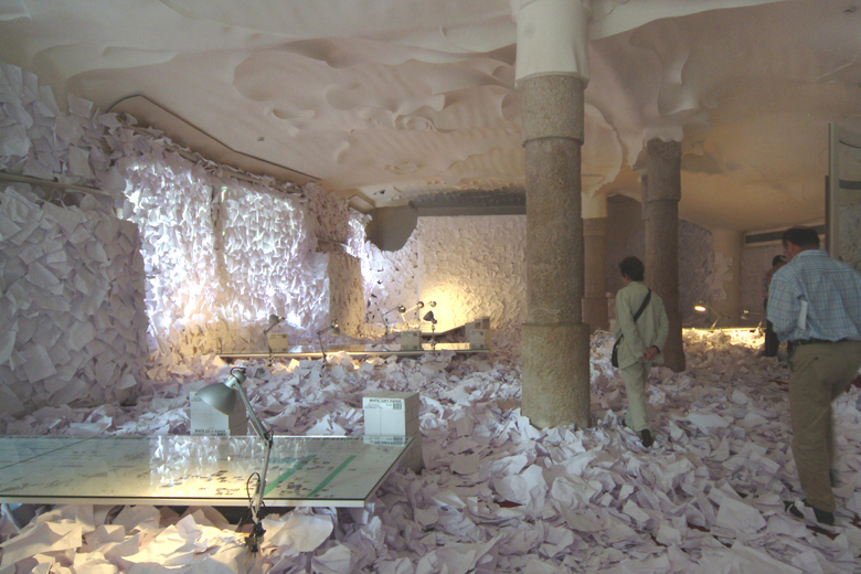The structure of the exposition/ Action “Towards a new balance of nature” emerged from the four elements: Air, Water, Earth and Fire, which define the contents of four workshops developed at Col•legi d’Arquitectes of Catalunya during the year 2005. The paper, A4, crinkled as a working unit invades all the space... ...at the walls a weave of fishermen contain it... ...on the floor a “a paper sea” goes through our legs... ...at the entrance a printer throw deliberately white papers, without continent but with a clear information: time goes on... Air, Water, Earth and Fire... four elements in the middle of a chaotic surrounding where the paper grooves, it is structured...., appear the printing... we stop and receive the information in four spaces of reflaxion. The natural light and its variations go through the tree leaves, through the papers... speaks with the order and the mess, with Gaudi’s pillars and caress the Jujol’s “sky-sea”