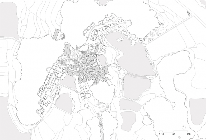 In this project, where the investor comes from the village itself, the aim is to find a renewal strategy in which both visitors and residents can participate. In the analysis of the existing urban pattern, the architects discovered that the buildings were placed along the contour lines. To the rear lies the hill, which frames the settlements with its dense forest, while open spaces orientate to the ponds. The quality and form of the open spaces became a defining element for the new settlement strategy, which is composed of abstracted fragments of the existing T-shaped exterior spaces in the hamlets. After optimization on site, the new exterior was created, which balances visibility and orientation. The remaining areas became the footprint of the new buildings. This strengthens the local identity and fits the new organically into the landscape.