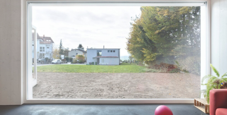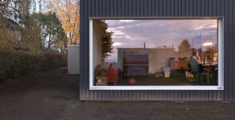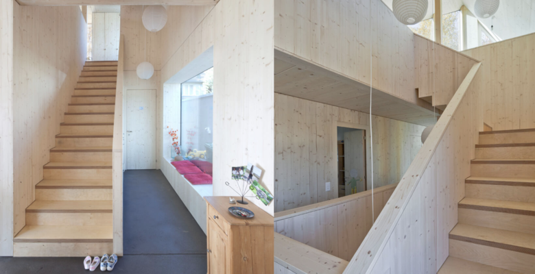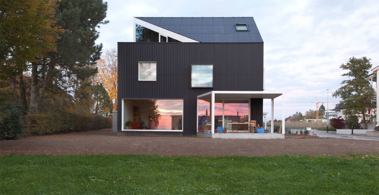 This house for a family of four is located in Bellmund, Switzerland, nearby Biel. Situated on a small plot, the structure’s “house” shape maximizes its height to ensure views of Lake Biennem, while a terrace space is cut from the roof volume. The house has a wood structure, as is usual in Switzerland. The skin is clad in grey industrial panels – a rough and weather resistant material with low costs. In contrast to the modest and functional exterior, the wooden structure is revealed within to give the interior an inviting sense of warmth.