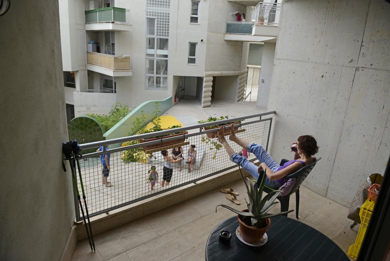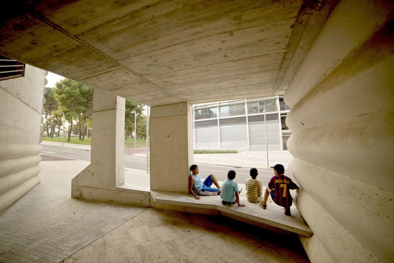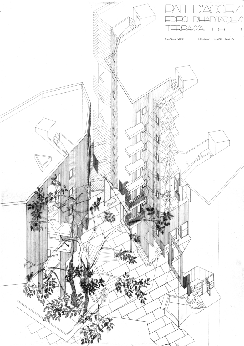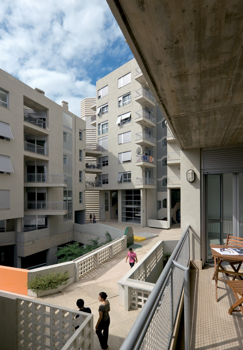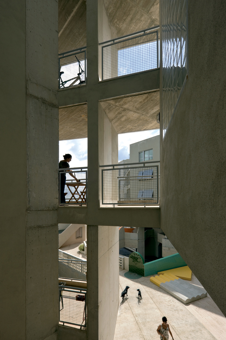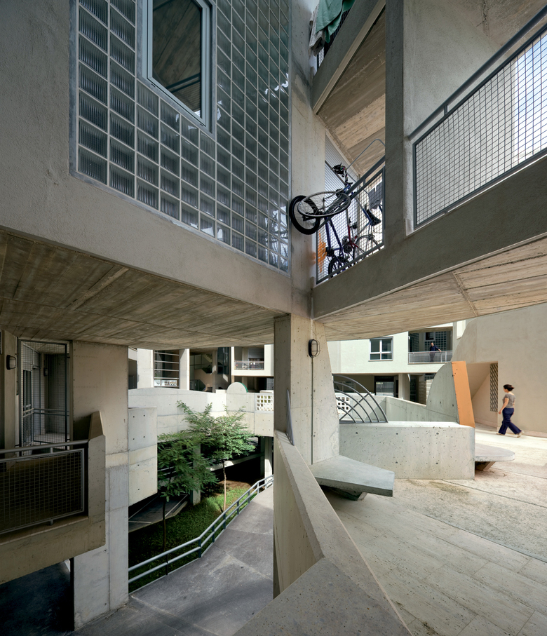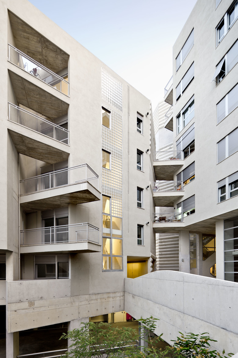 Social housing is one of the most significant and difficult challenges for architects today. At this time of global crisis, collective housing buildings can help to stabilize and restore the confidence that seems to have been lost in many sectors of society. In this context, architecture can play a decisive role in addressing our need to trust and count on neighbours, and therefore in creating a community that can support us in time of need. This building for 111 social dwellings is situated in the outskirts of Barcelona, facing an area of natural landscape and pine trees parks. The building defines a central courtyard and organizes the 111 dwellings around it, with the aim to create a neighborhood which acts as a community. This communal patio is a platform for social gatherings, inviting people from a wide variety of backgrounds and cultures to relate and socialize. This neighborhood represents for them the first social structure within society, helping to revert the actual tendency towards isolation and individuality. The patio contains three trees, some benches and a fountain, serving as the main entry open air vestibule to the houses. The journey from the street to the houses is modulated by a sequence of scales, progressively moving from the most open and public spaces at the street to the intimacy and privacy of the home. From one end to the other, from the bedroom to the street, the route is constantly varied. Family greetings intermingle with those of their neighbors in the patio, making the space an extension of the “hearth”, somewhere friends and acquaintances can share their daily lives in a second circle of intimacy.