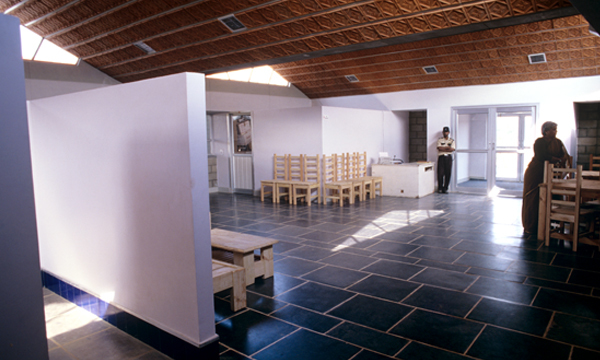 A warm domestic feel is given to the approach route leading to sterile process halls; not only by the change in scale provided by the low undulating roof but also through materials used, echoing the architecture of surrounding villages.