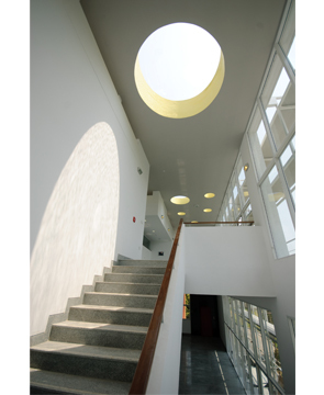 The perforated roof of the interior street incorporates a raised clerestory roof with circular skylight and vents that provide a natural dappled light quality to the interior while allowing the building to breathe.