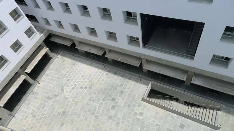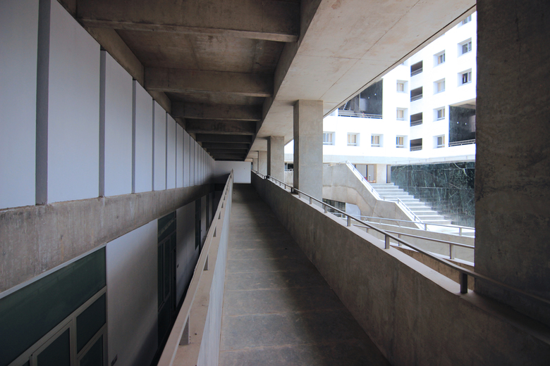 The programs are visually distinguished by use of materials; exposed concrete for the service areas, green marble and kota stone in the public spaces and white plaster for the residences.