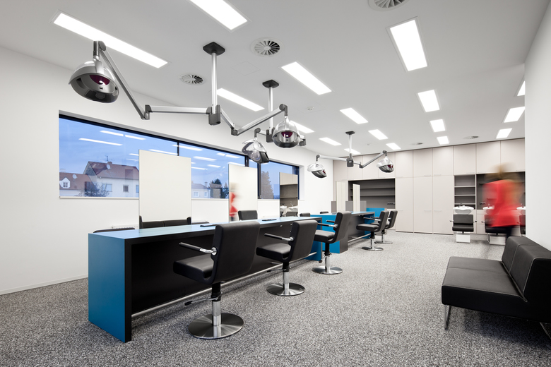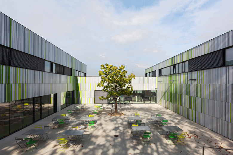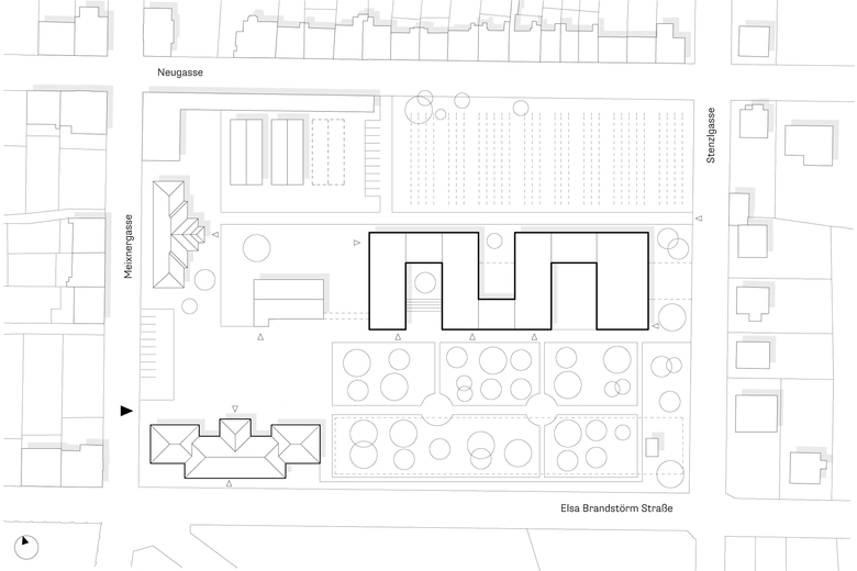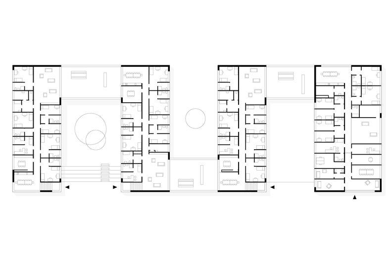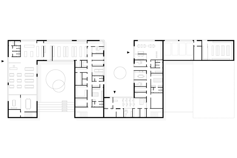 Ruhe und Helligkeit – An den geschützten Innenhöfen liegen ebenerdig die Lehrwerkstätten, wie Küche, Wäscherei und Friseur, die von KundInnen aus der Ortschaft besucht werden. Ein großer Speisesaal für etwa 100 Personen, in dem Kaffee und Kuchen auch für Gäste angeboten wird, liegt stirnseitig, einladend öffnet er sich zum älteren Bestand.