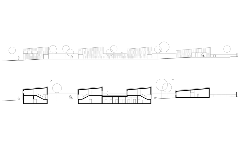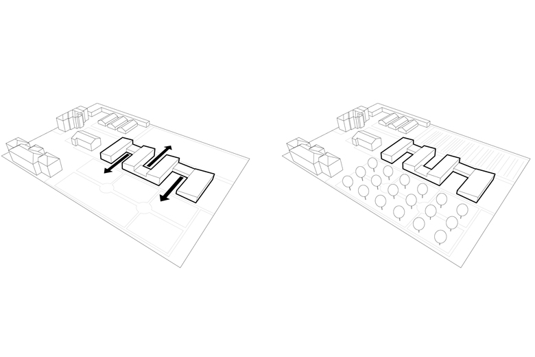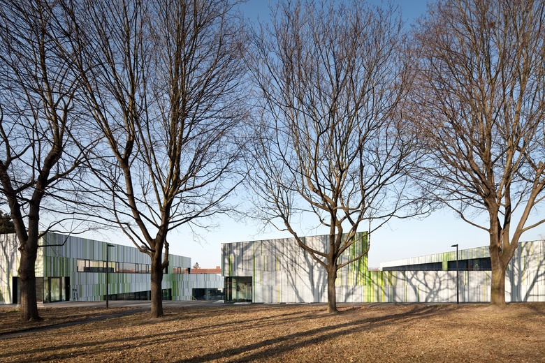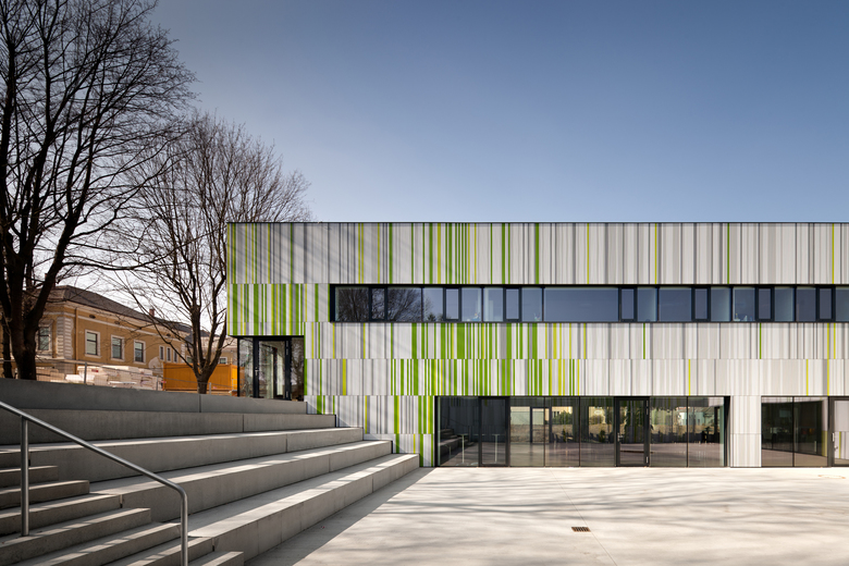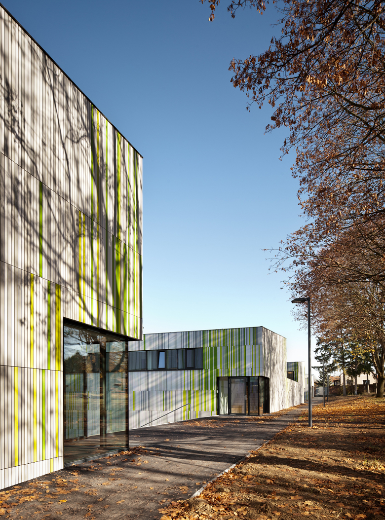 Neue Landschaft im Ahornhain – Dem gewachsenen Ensemble des Landesjugendheims mit Verwaltungsgebäude (1890), Schule, Kapelle (Sechziger Jahre) und Wirtschaftsgebäude, das den modernen Anforderungen gemäß von den Architekten adaptiert, neu gegliedert und vergrößert wurde, wurde ein mäandrierende – bis zu zwei Stock hoher – 93,30 Meter langer Baukörper zugefügt.