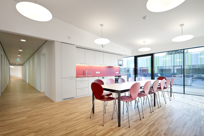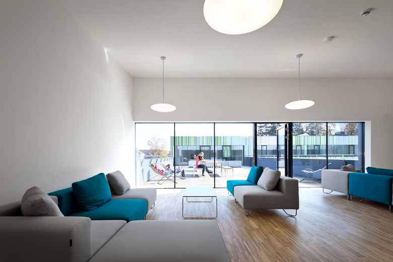 Das satte Grün der Umgebung ist in alle Räumen durch die großen Fassadenfenster erlebbar, schafft Ruhe und Helligkeit: Ankommen und Zuhause sein – hier auf Zeit und im Leben draußen hoffentlich für immer.