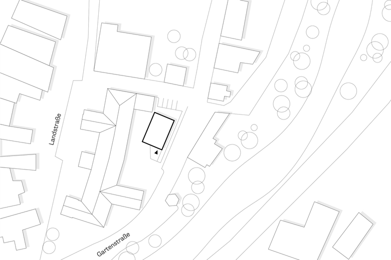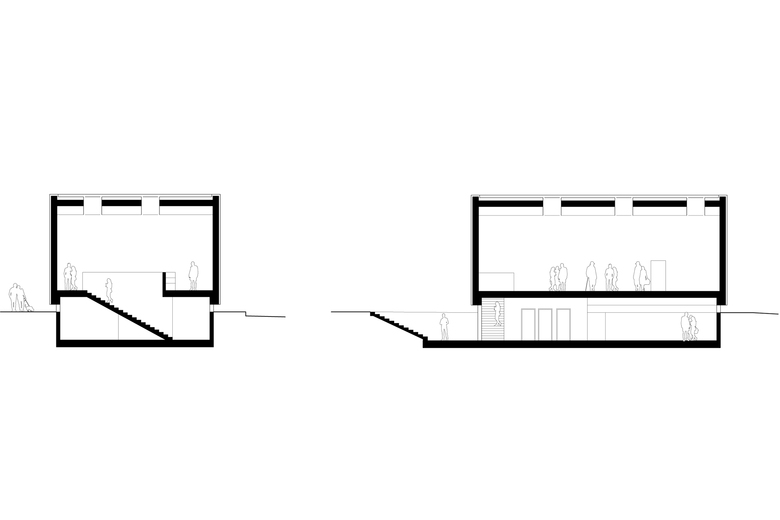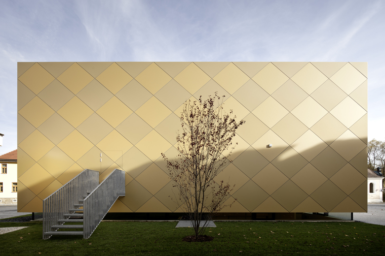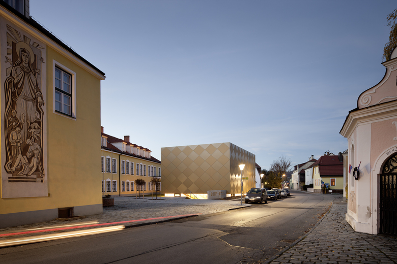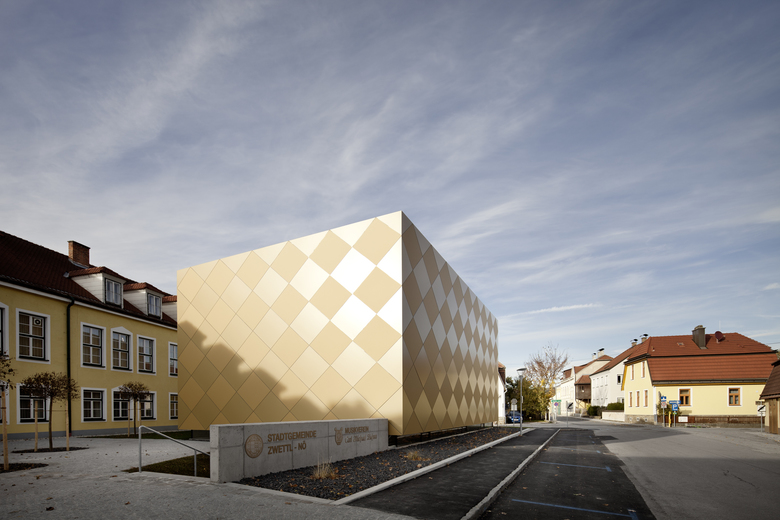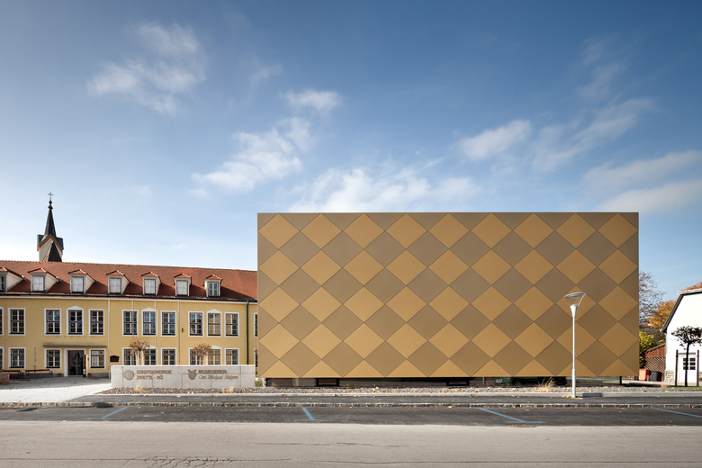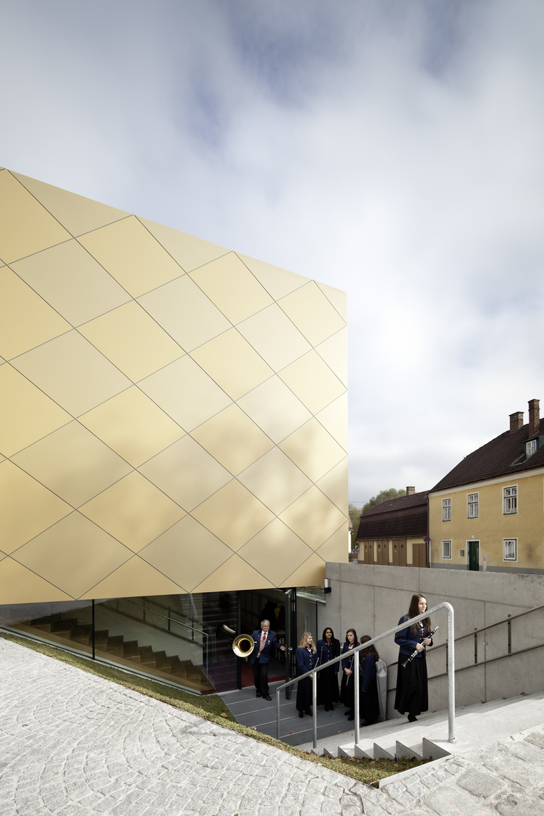 Markantes Zeichen am Platz – Die Gemeinde wagte mit uns eine selbstbewusstere Geste. Wir stellten einen acht Meter hohen, hermetisch geschlossenen Stahlbetonkubus auf den Platz davor. Keine Perforierungen, keine Auskragungen. Über eine Rampe und eine verdeckte Türe gelangen die KünstlerInnen ins Innere. Ein goldener Würfel für die Musik. Durch das Fensterband des unteren Geschosses, das in die Erde versenkt wurde, schwebt der Klangkörper über dem Platz.