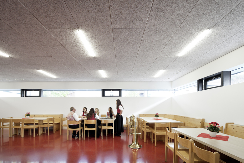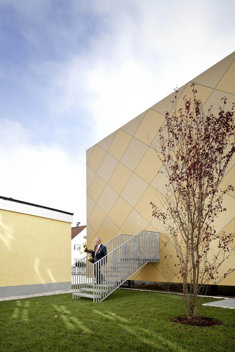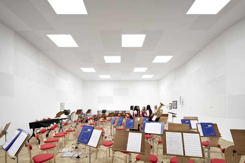 Um die akustischen Anforderungen optimal zu erfüllen, musste der Proberaum eine bestimmte Raumhöhe und eine Mindestfläche pro Musiker aufweisen, was die Größe des Kubus mit 156m² letztlich bestimmte. Der schlichte weiße Saal mit Oberlichten und fünf Meter Höhe kann auch als Konzert- oder Hochzeitsort genutzt werden. Bisher, so heißt es, wollen die BlechmusikantInnen aber ihre neue Bleibe (noch) nicht teilen.