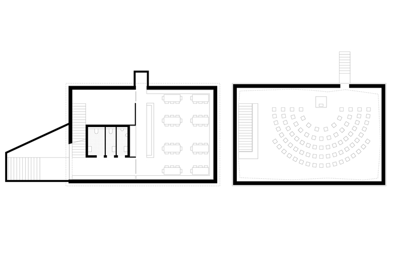 Einfache, klare Struktur – Das Innere hinter der vorgehängten und durchlüfteten Fassade, mit seinen 11x17 Meter großen Platten, gibt sich so einfach strukturiert wie sein Äußeres. Oben der Übungsraum, darunter die Sozialräume durch eine Treppe erreichbar. So einfach, so logisch.
