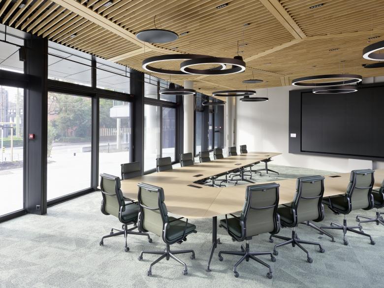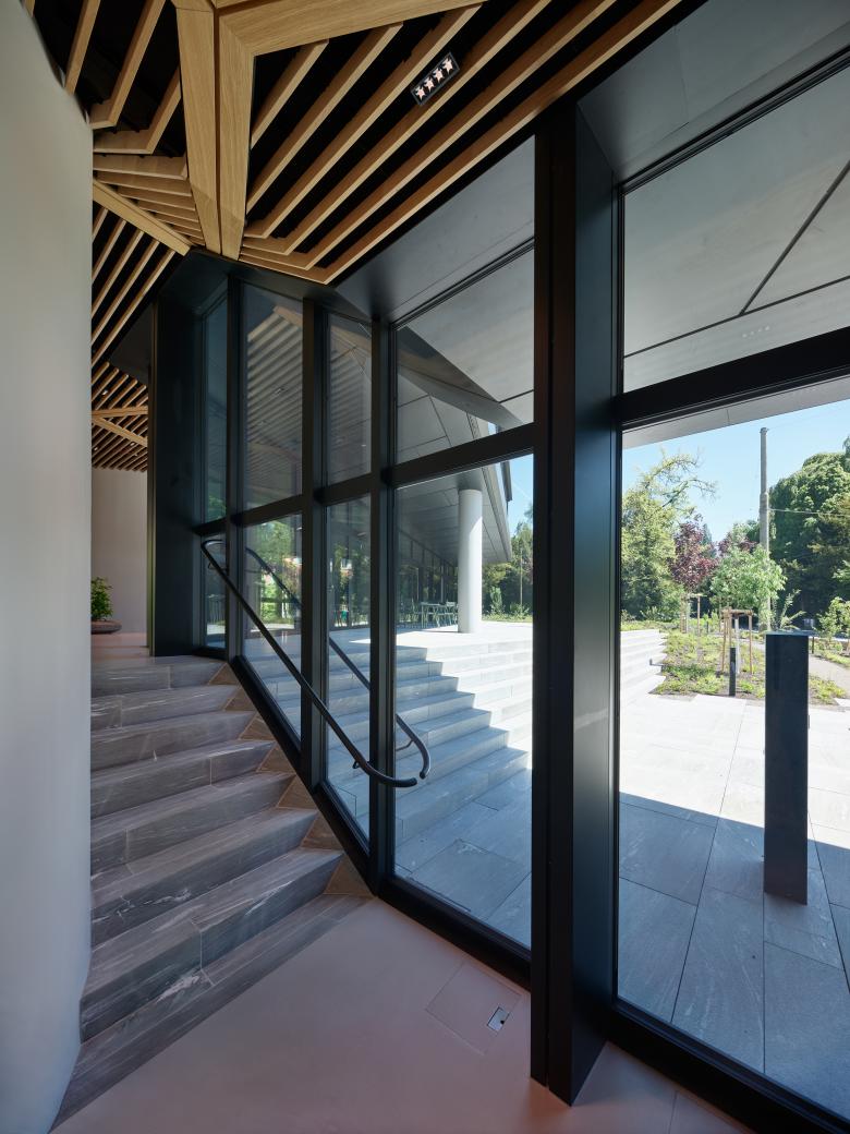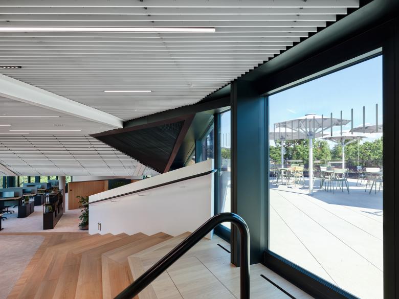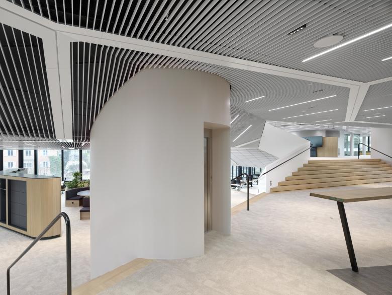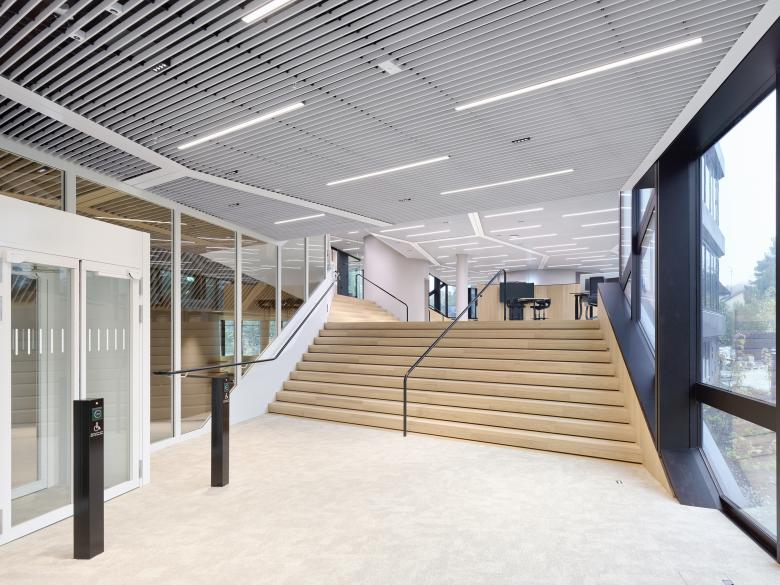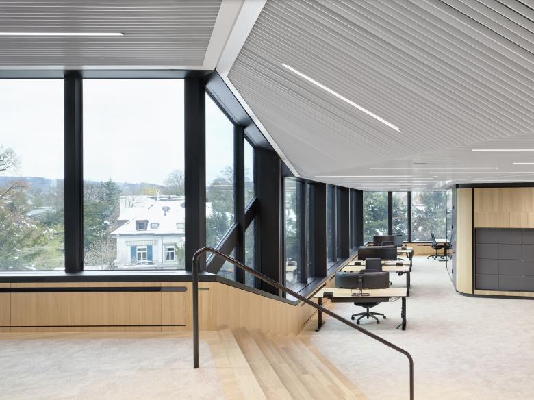 Die um ein Drittelsgeschoss vertikal versetzten Arbeitsplattformen schaffen Arbeitsgruppen von ca. 30 Arbeitsplätzen, die jeweils in engem räumlichem Bezug zum Grossen Ganzen steht.