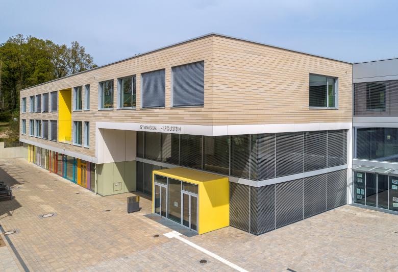 Der Schulstandort Gymnasium Hilpoltstein wird neu definiert. Zum einen ist die Bausubstanz sanierungsbedürftig, zum anderen ist der Bedarf nach neuen Unterrichtsformen, die offenere Räume erfordern groß. Daher wird die Eingangssituation völlig neu kodiert. Die Schule öffnet sich nun zum Ort. Bereits von weitem ist die Eingangssituation sichtbar. Über mehrere Plateaus nähert sich der Besucher der Schule, dem Eingang und der Aula. Der Pausen- und Eingangshof erhält einen offenen, grünen Charakter. Schüler, Lehrer und Besucher betreten die Schule über die Aula, ein 2-geschossiger zentraler Raum, das neue Herz der Schule.