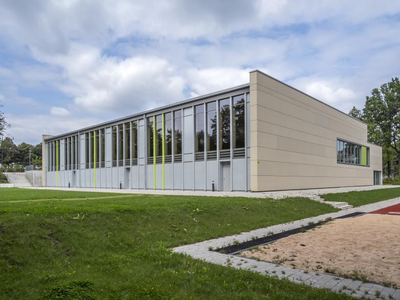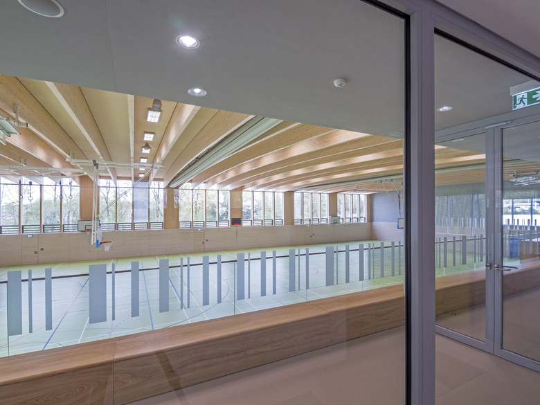 Die neue Dreifeldsporthalle am Gymnasium in Eggenfelden wird, nach Abbruch der bestehenden Mädchensporthalle wieder an das Gymnasium im Nordosten angebaut. Der Halleneingang liegt, im Bereich des bestehenden Vordaches, sodass die Sporthalle witterungsgeschützt erreicht werden kann. Das Gelände hat eine leichte Hanglage. Daher kann der Höhenunterschied zwischen dem oben gelegenem Zugang vom Pausenhof und dem tiefer gelegenen Freisportflächen ausgenutzt werden. Das Hallenniveau liegt nahezu ebenengleich mit dem westlich gelegenem Kleinspielfeld. Den Bereich der Halle prägt ein Hallentragwerk aus dichtgereihten schlanken Holzbindern. Die Sporthalle befindet sich derzeit im Bau...
