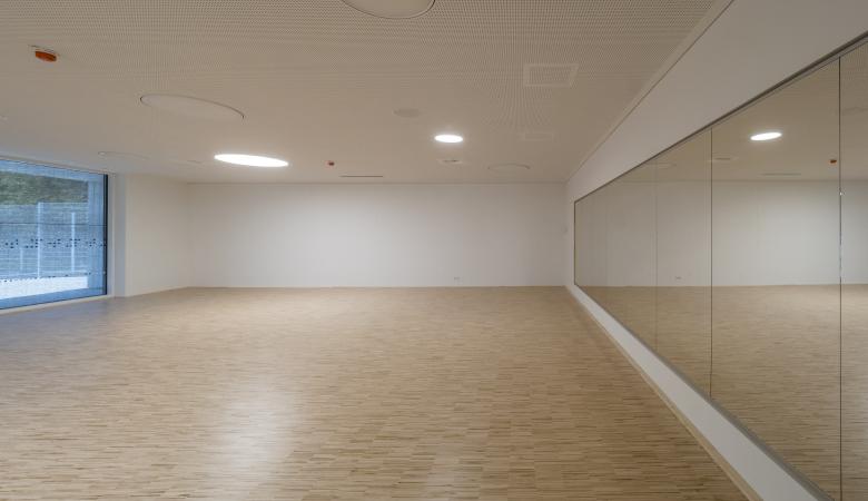 Die 22x45 m große Sporthalle kann mit Hilfe von zwei elektrischen Trennvorhängen in drei gleichgroße Hallenteile unterteilt werden. Es werden ein großer Geräteraum für alle 3 Hallenteile sowie je ein absperrbarer Schul- sowie Vereinsgeräteraum geplant.