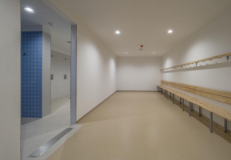 Über die beiden seitlich orientierten Treppen und einen Aufzug, wird die Hallenebene im Untergeschoss erreicht. Hier befinden sich vier Umkleiden mit angrenzenden Duschen mit Toiletten für die Schüler/Sportler, sowie 2 Lehrer/Übungsleiterräume als auch eine zusätzliche kleine Vereinsumkleide.