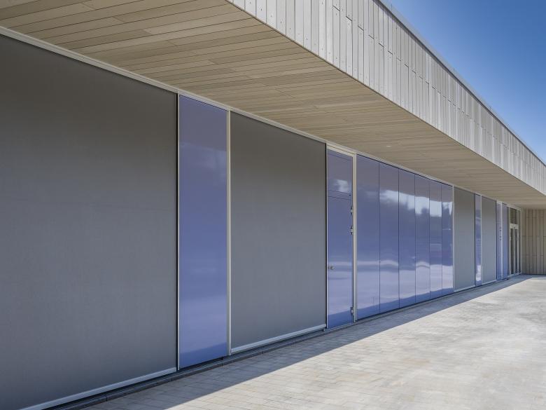 Das Sportfeld erhält durch die großzügigen Fenster an der Nord-Ost Fassade, sowie über das Oberlichtband von der Süd-West Seite natürliches Licht. Fassade Süd-Ost und Nord-Ost: Die Fenster als Festverglasung (nicht zu öffnen) gewährleisten die Reduzierung der Lärmentwicklung in Richtung der angrenzenden Wohnbebauung. Die oberen Lamellenfenster an der Nord-Ost-Fassade dienen der Entrauchung gemäß Brandschutznachweis. Diese könnten gelegentlich kurz zur natürlichen Durchlüftung geöffnet werden. Die Sporthalle wird eingegraben und fügt sich höhenmäßig angenehm in die Umgebung ein, auch bezogen auf die angrenzende Wohnbebauung.