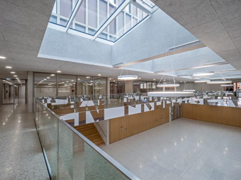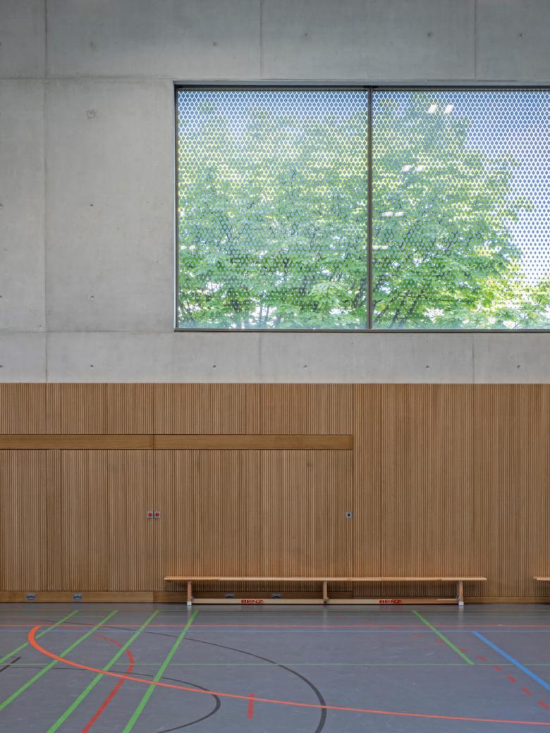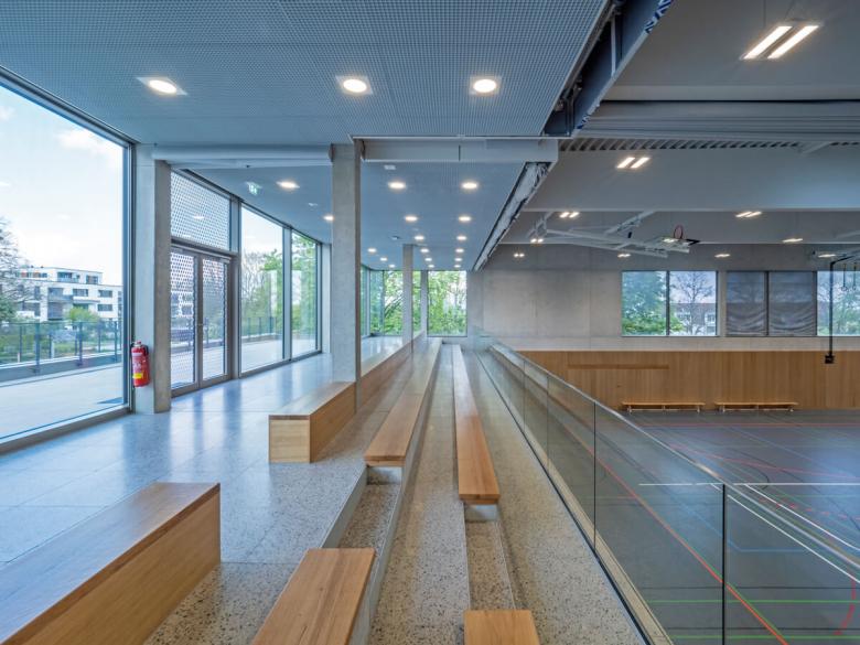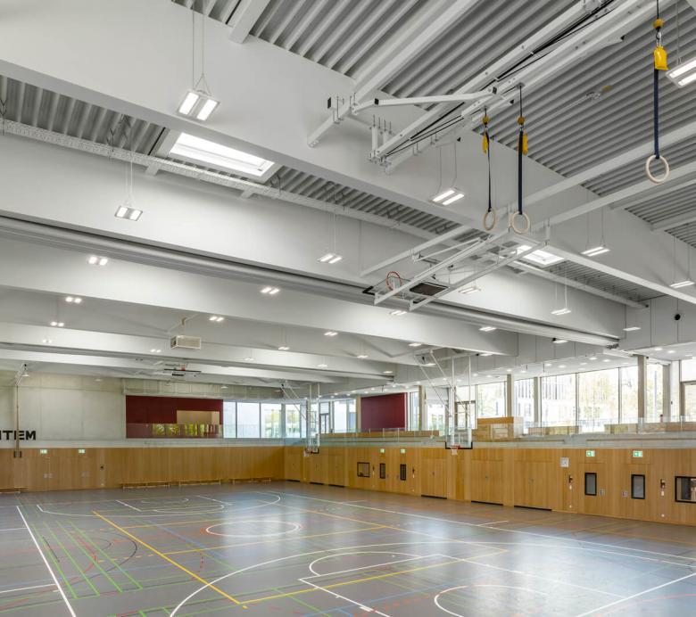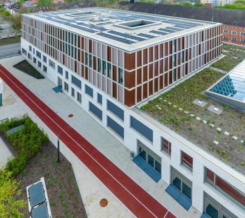 Grund- und Mittelschule mit Mensa, Ganztagesbetreuung, Dreifachsporthalle und Tiefgarage.