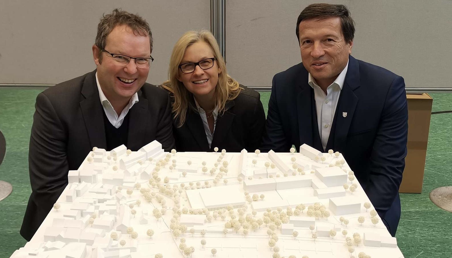 So sieht der Entwurf für die neue Halle (im Modell in der Mitte zu sehen) aus, den hier Arnd Rudolph und Stefanie Fuchs von der Partnergesellschaft Fuchs und Rudolph sowie OB Max Gotz (v. l.) zeigen. © Mayls Majurani
