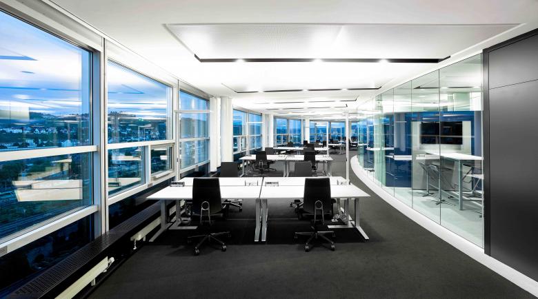 Die Ellipsenform des Gebäudes wurde erkennbar bei der Innenraumgestaltung berücksichtigt, so findet sich die Architektur über die gesamte, neugestaltete Bürowelt wieder. Ziel des neuen Raumkonzeptes war es, alle Arbeitsplätze offen und gleichwertig zu gestalten und für eine helle, übersichtliche und kommunikative Raumstruktur zu sorgen. Dies gelang durch die Neu-Positionierung der Arbeitsplätze entlang der Innen- und Außenfassaden und der markanten Neugestaltung der Decke in Verbindung mit einem neuen Beleuchtungskonzept. Abgerundet wird das Raumkonzept durch den Einsatz von gehobenen Materialien die nicht nur der Optik dienen, sondern zugleich die Akustik im gesamten Bereich unterstützen.
