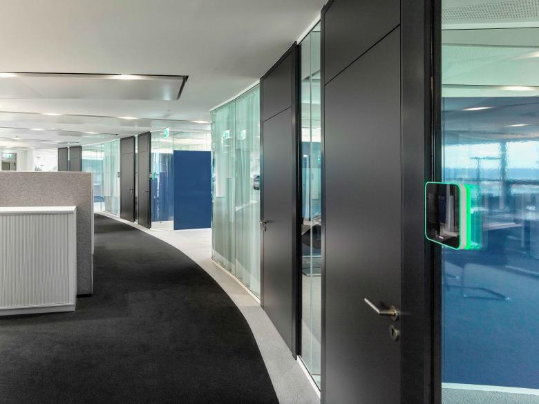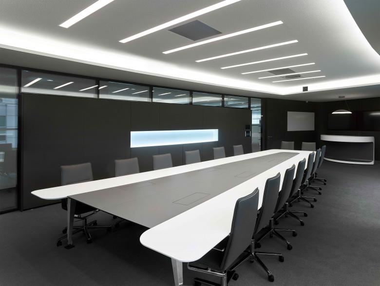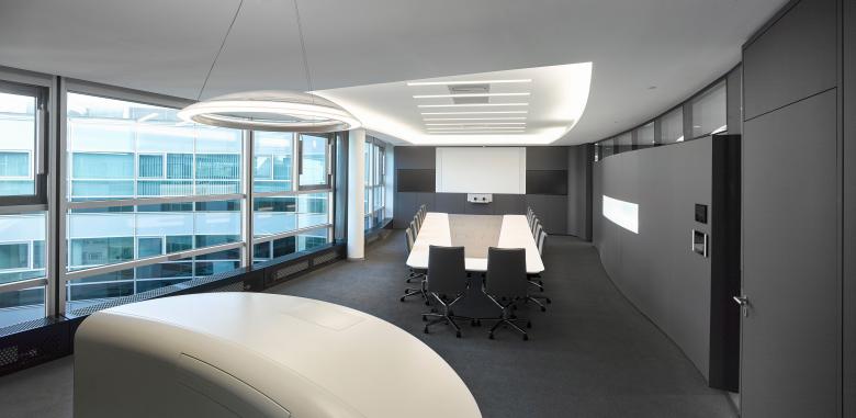 Im Kern der Bürowelt befindet sich die Besprechungsraumzone. Die Besprechungsräume wurden transparent gestaltet und formtechnisch der Ellipse angepasst. Durch den Einsatz von lichtdurchlässigen Vorhängen können die Räume gegen Einsicht geschützt werden, verlieren aber im Gesamtbild nicht an Transparenz.