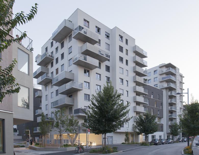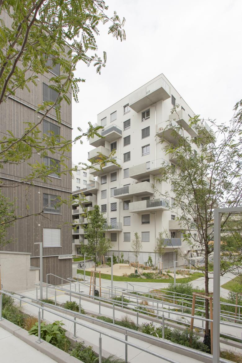 Die Wohngebäude sind in beinahe allen Geschossen, kombiniert mit Dachgärten, Begrünungen und Freiräumen, miteinander verbunden.