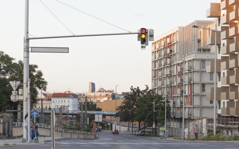 Wir reagieren einerseits auf die „laute“, aber auch lebendige, städtebauliche Situation mit der angrenzenden Bahntrasse und Straße, andererseits auf die, auf Grund der Gebäudehöhe, reizvolle Situation der Westorientierung und Abendsonne – darin liegt die Hauptkomponente des architektonischen Ansatzes.