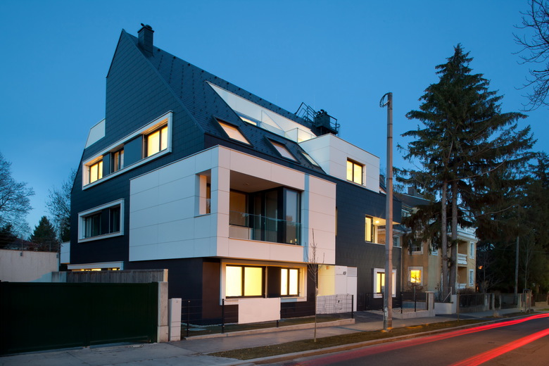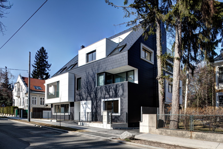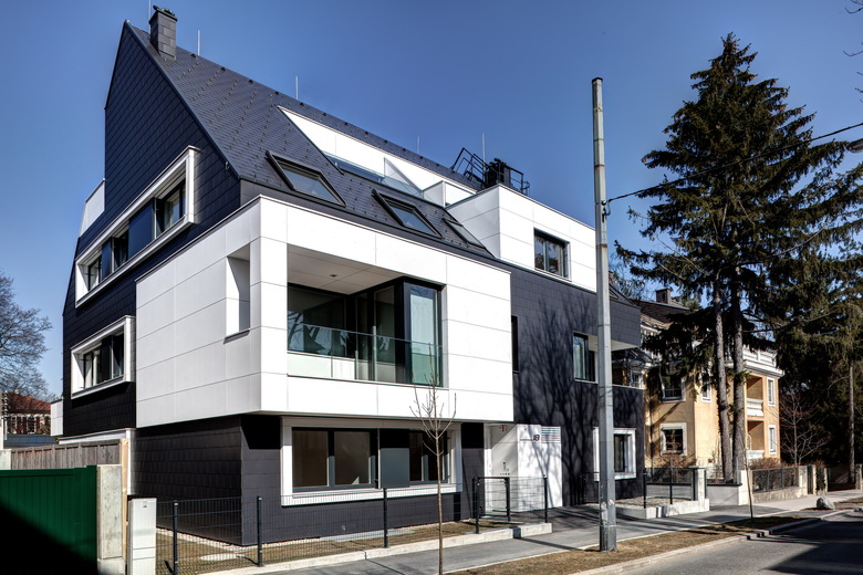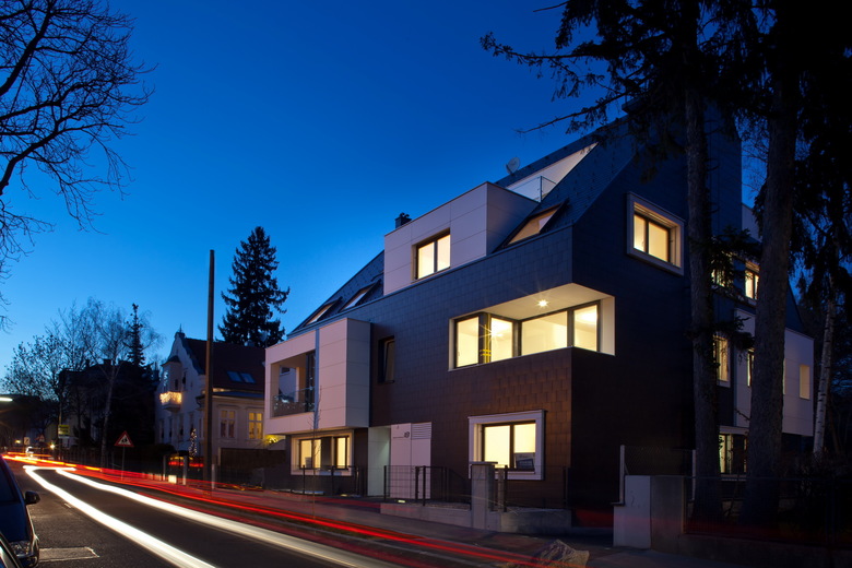 Neuinterpretation der klassischen Stadtvilla – Der Wohnbau in der Jagdschlossgasse mit sechs frei finanzierten Eigentumswohnungen wurde als Direktauftrag eines privaten Bauherren in Niedrig-Energie-Bauweise realisiert.