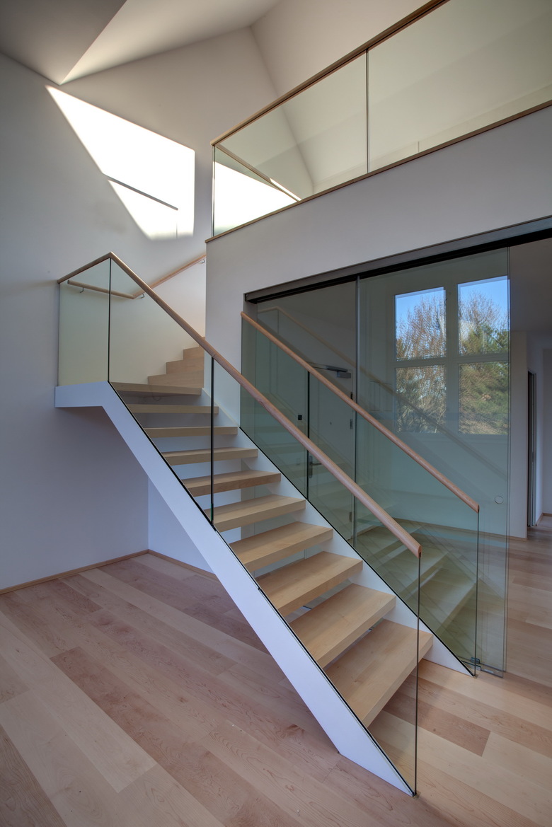 Auch die für diese Gegend typische dunkle Holzschindelfassade wird zitiert und mit kleinformatigen, anthrazitfarbenen Faserzementplatten in einen modernen Werkstoff übertragen. Diese Gebäudehülle zieht sich durchgängig über alle Wandflächen der Hauptkubatur und weiter bis über das Dach. Für eine homogene Gesamtwirkung wurde die Dachentwässerung über innenliegende Rohre geführt.