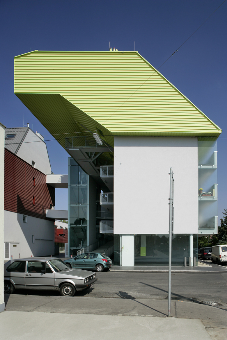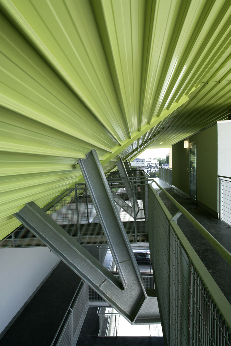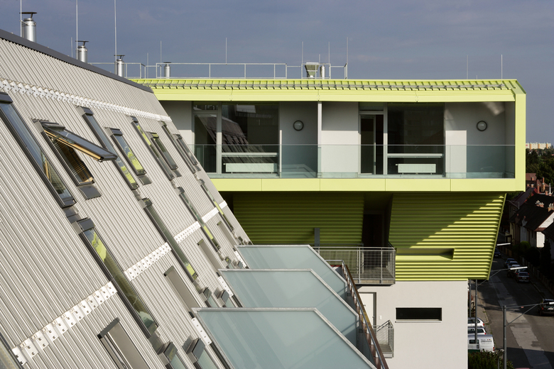Die gelbe Zipfelmütze. So expressiv die abschließende Geste auf den ersten Blick erscheinen mag, ist sie doch Resultat eines logisch und stringent aufgebauten Querschnittes der obersten Maisonette-Wohnungen. Die Nutzfläche wird durch diese Maßnahme maximiert, Dachschräge und Treppenverlauf ergänzen einander zu einer feinen Symbiose, eingepackt in schwefelgelbes Trapezblech-Profil. (…)