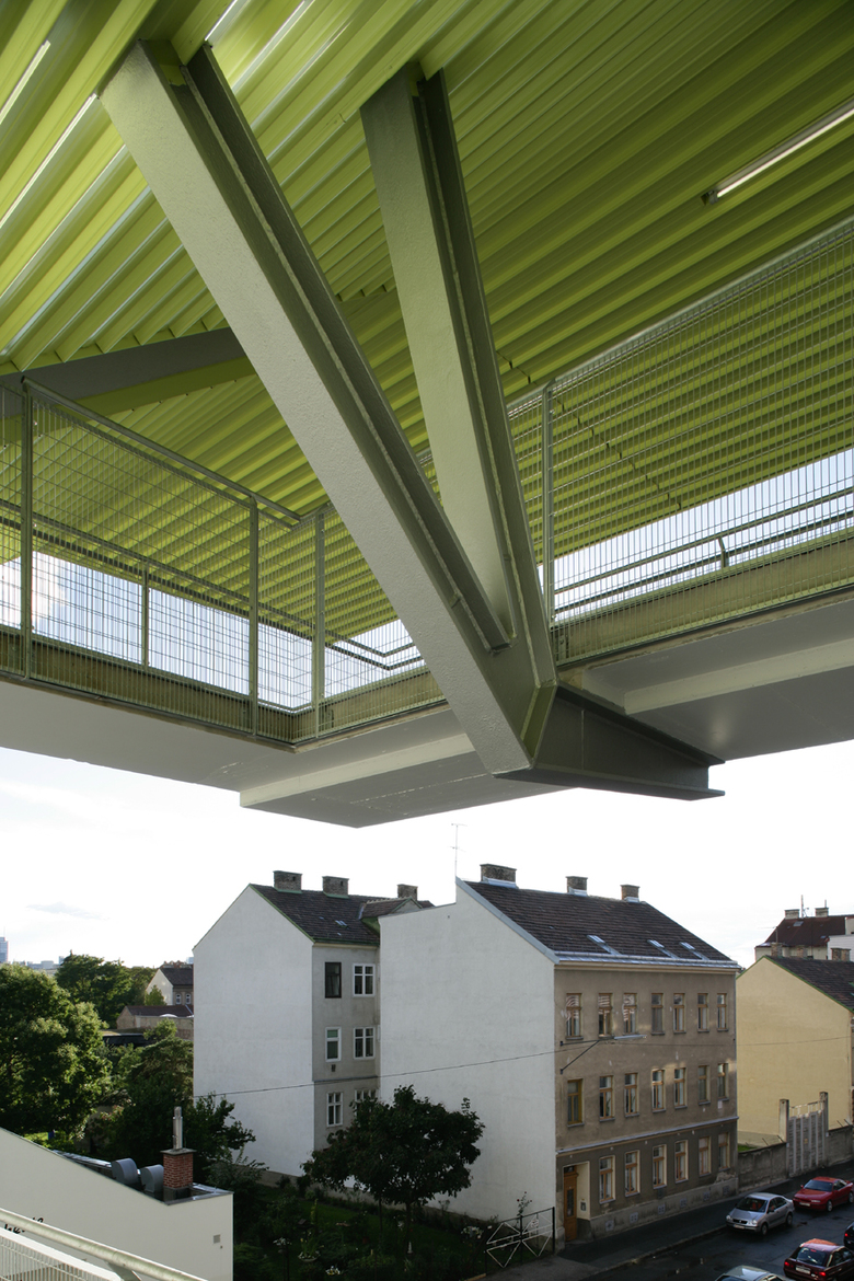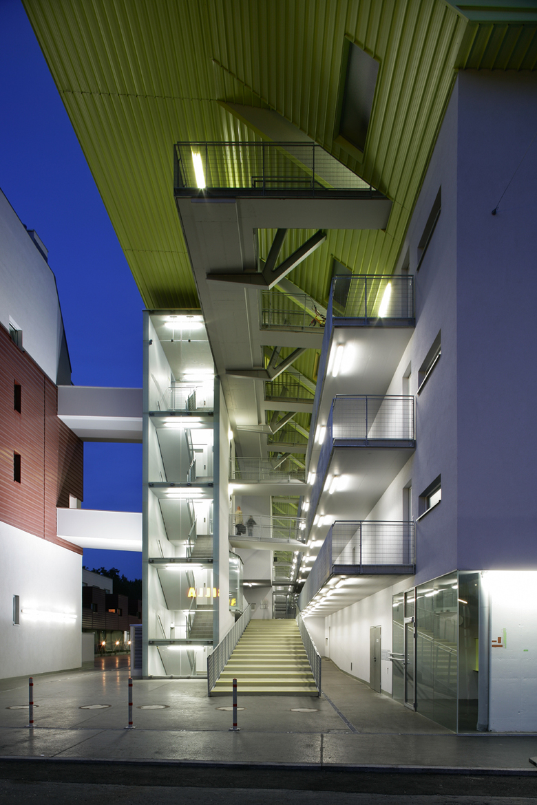 Eine breite Rampe sticht ins Haus hinein. Man steht zwischen zwei Bauteilen, mitten in einer städtischen Schlucht, die ein bisschen an die engen Gässchen von Napoli erinnert. (…) Selbst bei Regenguss und Schneegestöber bleibt man hier trocken. Denn der gesamte Erschließungsbereich wird von einem periskopartigen Dachgeschoß bedeckt, das sich waghalsig über die Schlucht hinauslehnt. Auf diese Weise ergibt sich im vierten Stock eine riesige Gemeinschaftsterrasse. (…)