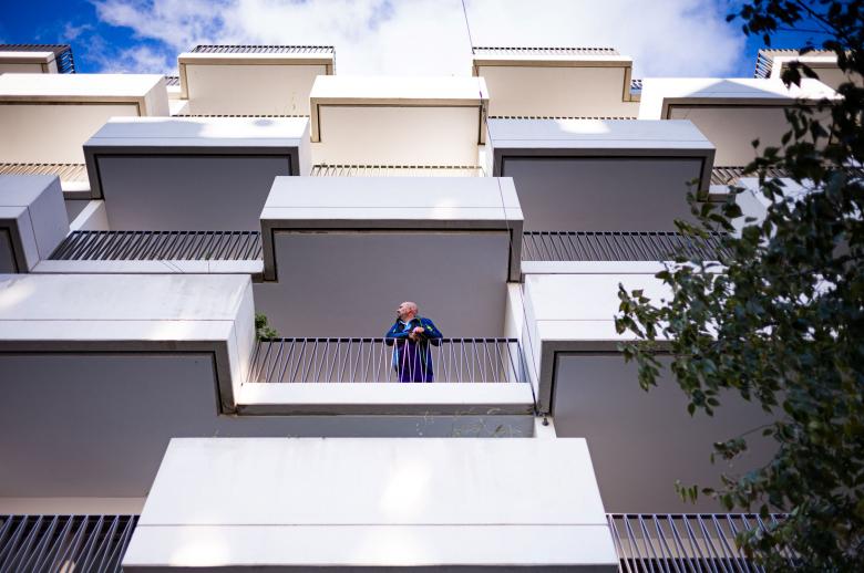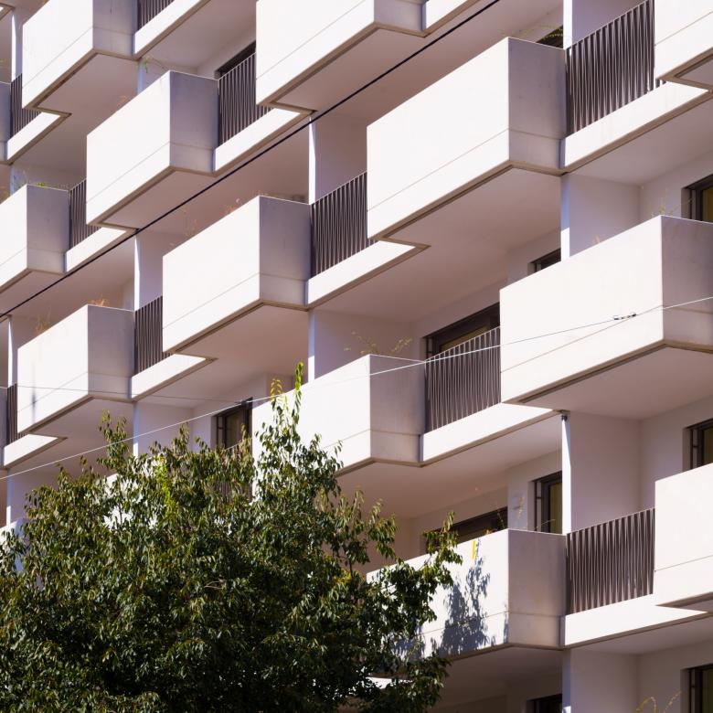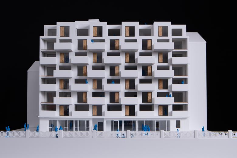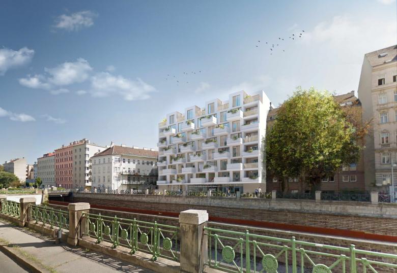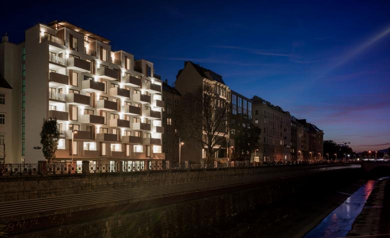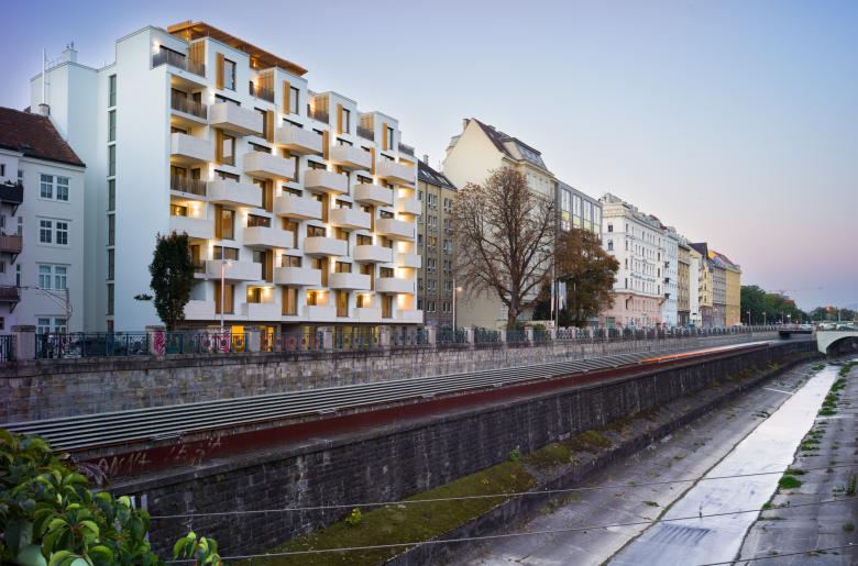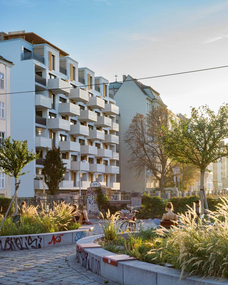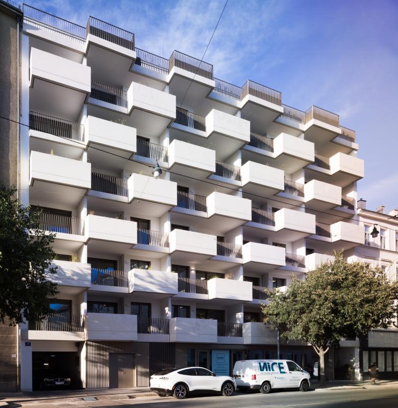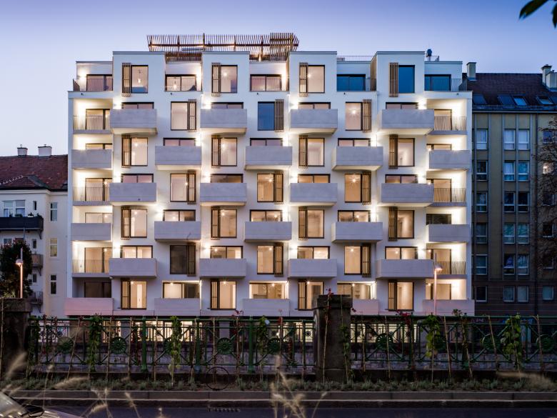 Die hellen, lichtdurchfluteten Wohnungen sind zur Schönbrunner Straße als auch zur Wienzeile orientiert und bestechen durch ihre großzügigen Verglasungen. Alle der 60 Wohnungen verfügen über Freiflächen in Form von Balkonen oder Loggien. Durch deren Versetzung gibt es eine weite und offene Situation im Außenraum. Jede Freifläche wird mit Pflanztrögen bestückt, so dass die MieterInnen ihren eigenen Grünbezug haben können.