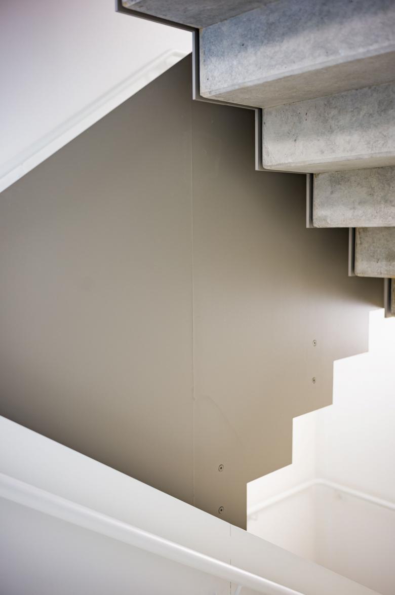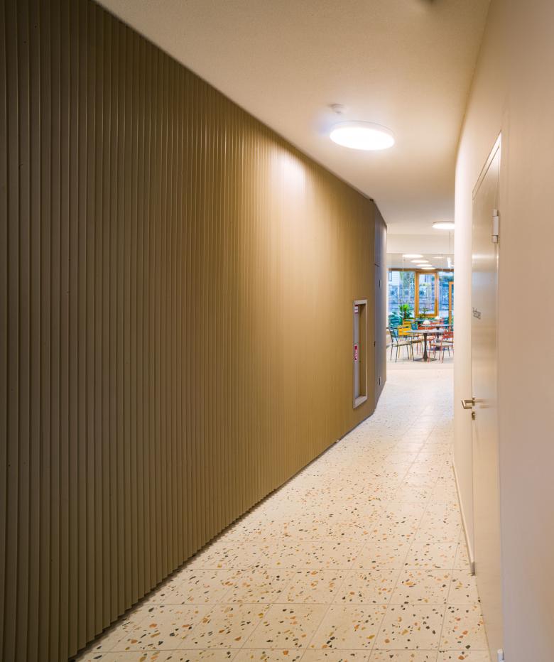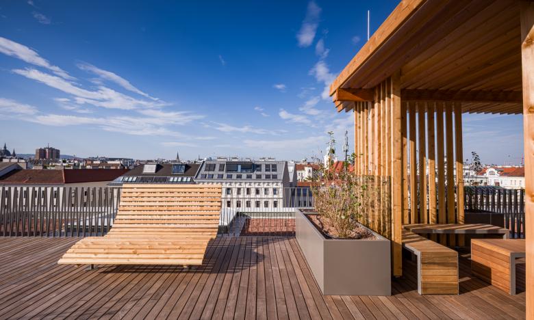 Den MieterInnen stehen auf dem Dach Pflanztröge und Mietterrassen zur Verfügung, sodass das Dach als lebendige Szenerie belebt wird. Die Gänge zu den Wohnungen sind ebenfalls hell und haben von seitlich und oben natürliches Licht und Lufträume. Die Stiegenhausportale und Handläufe werden aus Holz ausgebildet, die Wohnungen selbst haben Vollholzparkett. Generell werden alle Materialien und Farben von außen nach innen gezogen und gewisse Elemente wiederholen sich im unterschiedlichen Kontext. Im Fahrradraum werden Mietboxen zur Verfügung gestellt und zusätzlich wird ein Jugendspiel- und Gemeinschaftsraum angeboten.