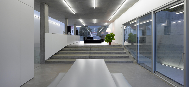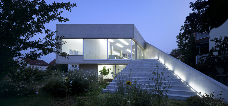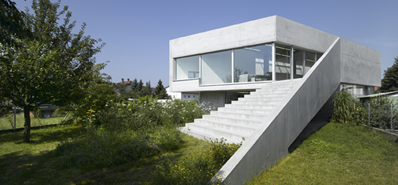 Was Triath vordergründig so interessant macht und dem Projekt einen gediegenen Charme verleiht, ist die gepflogene Kultur der Höhenüberwindung. Beim Kunstgenuss soll man nicht hecheln: Flache Treppen im Innen- und Außenraum verwandeln hastiges Stiegensteigen in vornehmes Gleiten. Gestalterischer Höhepunkt ist die Betonrampe an der Gartenrückseite des Hauses. Wie eine Zunge wird sie ausgestreckt, lang gezogen und schließlich in die Wiese gelegt.