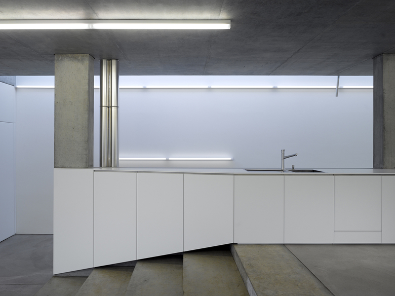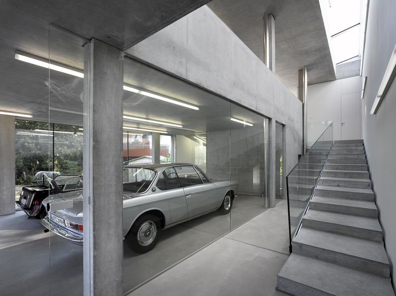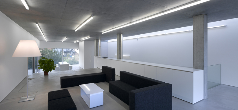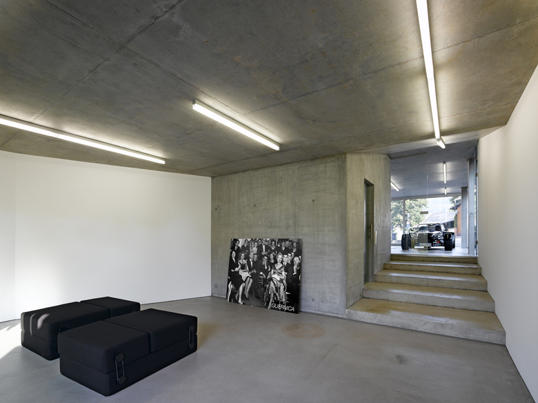 Die schlichte Box aus grau belassenem Stahlbeton ist angehoben und schwebt über einem weit zurückgesetzten Erdgeschoß. Eine Seitenkante ging im Entwurfsprozess verloren, dafür wird eine Rampe bis auf Straßenniveau ausgeklappt. Ebenerdig befinden sich Eingangshalle, Lager und Sanitärräume. In der Höhe ist ein Monospace untergebracht, der gleichermaßen als Büro und Galerie dienen kann. Eines Tages sollen hier Besprechungen abgehalten, Bilder geschüttet, Sekt und Brötchen gereicht werden. Der Kunst ihren Raum, bleiben die Wände im neutralen Weiß. Sie nehmen sich als stiller Hintergrund zurück. Eine verglaste Nische dient als Archiv, kann bei Gelegenheit aber auch als Gästeraum für Künstler genutzt werden.