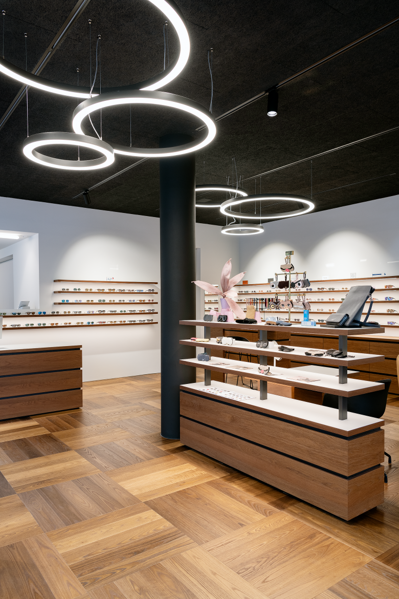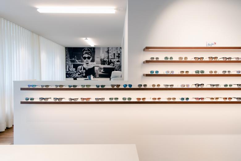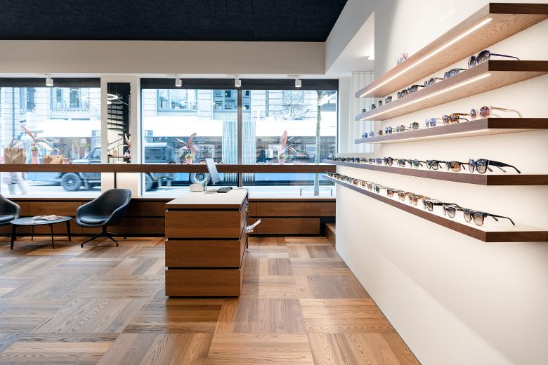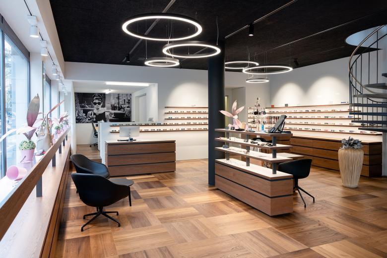 Die komplette Neugestaltung der bestehenden Räumlichkeiten zeigt einen durchgehenden, grosszügigen Verkaufsraum, der ohne schnell vergängliche, modische Accessoires oder «Trends» eine unverwechselbare Identität schafft. Dadurch werden Werte wie Präzision und Qualität vermittelt. In enger Zusammenarbeit mit den Auftraggebern wurde das Raumgefüge bis ins Detail organisatorisch aktualisiert. Die konsequente Formensprache, eine subtil-elegante Materialisierung und die spezifisch kreierte Möblierung stellen die Produkte in den Fokus. Die Präsentationsbereiche sind blendfrei beleuchtet und können flexibel gestaltet werden. Die ideale Anordnung der einzelnen Verkaufs- und Beratungszonen ermöglichen optimale Abläufe und direkte Interaktion mit den Kunden. Neue Materialien — Eiche als Holz für die Kundenzone und weißer Werkstoff für die Brillenpräsentation — dienen der «visuellen Erfrischung». Zusammen mit der gezielt eingesetzten Beleuchtung entsteht eine angenehme Atmosphäre für Kunden und Optiker. Die zurückhaltende Erscheinung des Verkaufsraumes, die eleganten und natürlichen Materialien, sowie die optimale Beleuchtung garantieren dem Optikgeschäft den zeitgemässen visuelle Auftritt, der die höchste Qualität der Optikerleistung widerspiegelt.
