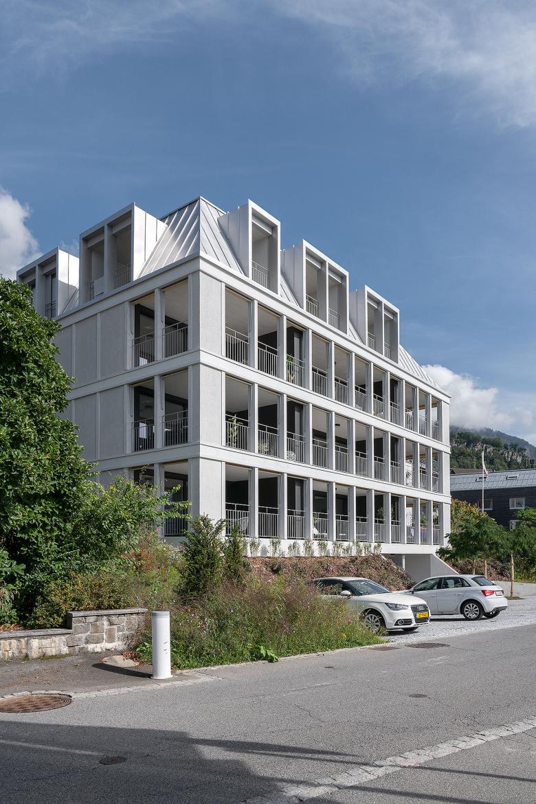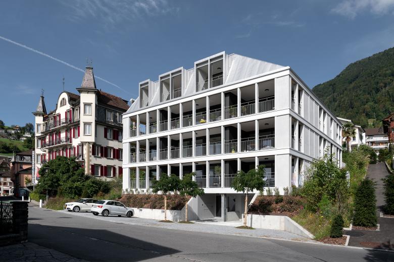 Die Seepromenade von Weggis ist geprägt von den repräsentativen Hotelbauten, welche zu Beginn des 20. Jahrhunderts erstellt wurden. Die herrschaftlichen und tektonisch aufgeladenen Gebäude bilden eine dichte urbane Struktur und stehen im Gegensatz zum angrenzenden Wohnquartier, mit seinen verstreuten, solitären Bauten. Volumetrisch ist der Entwurf als ein einzelnes Punktgebäude ausformuliert und gliedert sich selbstverständlich in die umgebenden Solitärkörper ein. Der Neubau hat eine selbstbewusste Präsenz, hält sich dezent zurück und reagiert angemessen auf den Bestand.