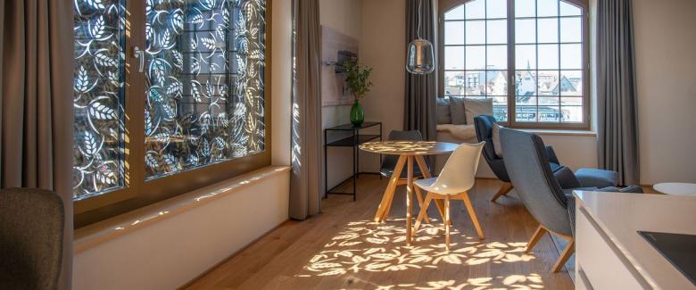 Der horizontale Sonnenschutz sorgt vor allem in der halb geöffneten Position für ein aussergewöhnliches Ambiente. Die in unterschiedlichsten Ausführungen erhältlichen Paneele erzeugen schöne Licht- und Schattenspiele im Raum. Ein besonderes Highlight ist diesbezüglich das Modell S-L, bei welchem die Kunden ihre individuelle Lochung in der Aluminiumplatte wünschen können.
