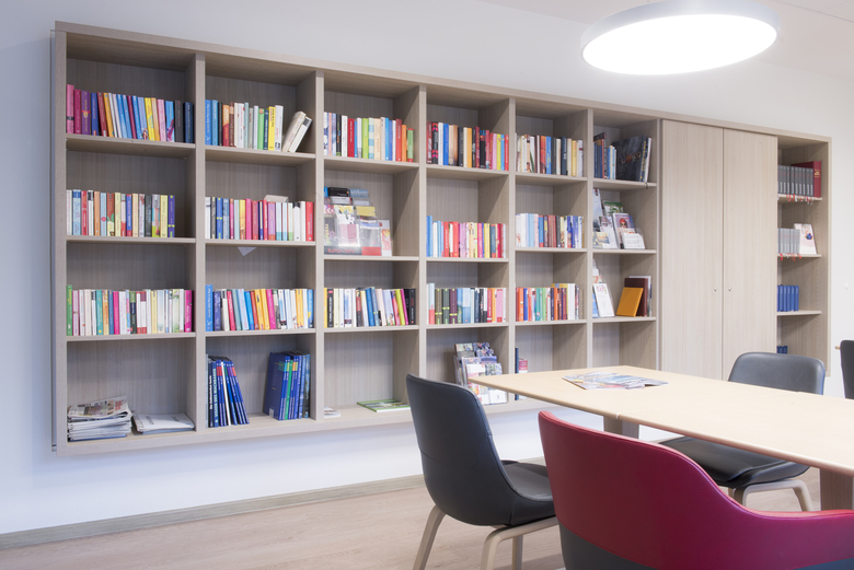 Fußböden und Decken sowie der Empfangstresen in der Eingangshalle wurden in drei Bauphasen saniert und mit neuen Sitzmöbeln ausgestattet. Eine Glaswand trennt nun den Eingangsbereich vom Lese- und Ruheraum. Von dort führt ein neuer Durchgang direkt in den Andachtsraum.