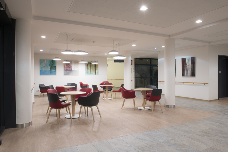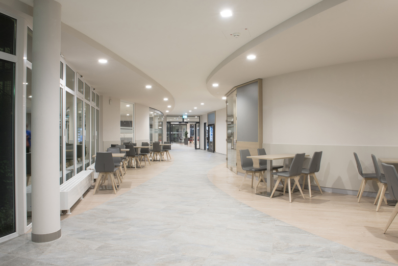 Die Magistrale in der Eingangshalle führt zur Cafeteria und einem weiteren, separaten Aufenthaltsbereich. Cafeteria und Lounge wurden in einem 2. Bauabschnitt saniert. Das gesamte Mobiliar wurde erneuert und besteht aus naturbelassenen, wertigen Materialien.