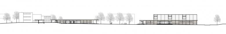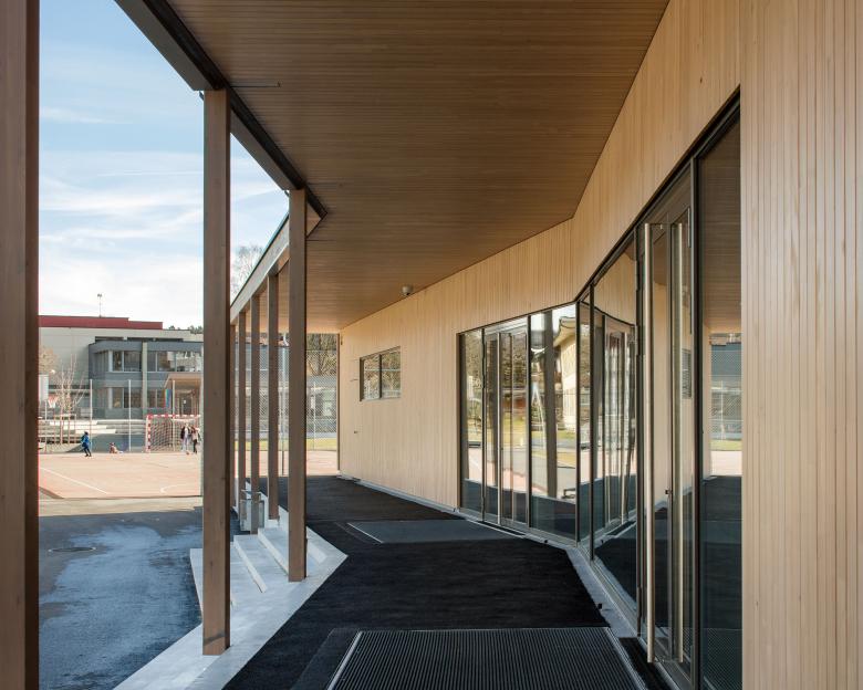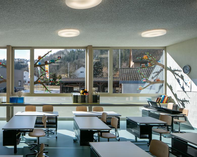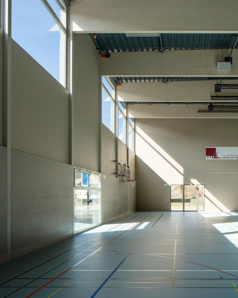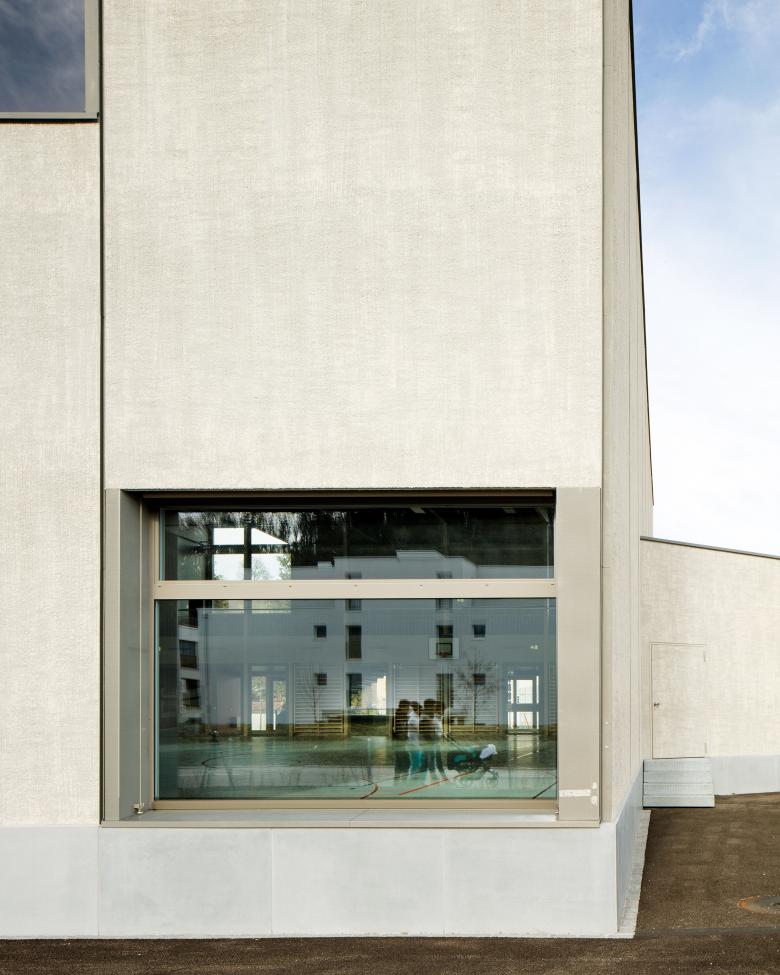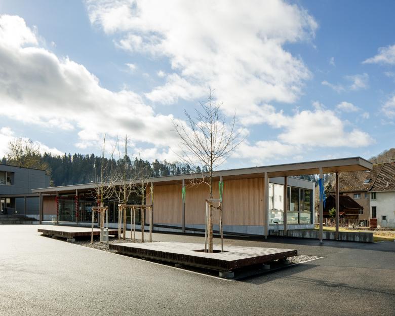 Der Bauplatz liegt im trapezförmigen Geviert, das als Ortsmitte und Schwerpunkt des öffentlichen Dorflebens fungiert. Der Abbruch der alten Schulturnhalle bildet die Voraussetzung für das städtebauliche Konzept des Erweiterungsprojekts: Der Schulhof öffnet sich neu nach Westen zu einem grosszügigen und attraktiven Freiraum, welcher sich bis zur neuen Mehrzweckhalle erstreckt. Der Schulneubau schirmt den Pausenplatz südlich gegen die Immissionen der Tösstalstrasse ab und bildet zusammen mit den Altbauten ein neues Ensemble rund um den zentralen Pausenplatz. Die Mehrzweckhalle fügt sich in die Verlängerung der Eingangs-fassade der Schulerweiterung ein und besetzt als markanter Eckstein die prominente Parzellenecke bei der Einfahrt ins Zentrumsgebiet. Die beiden Neubauten bilden durch ihre räumlichen Bezüge und ihre einladenden Laubengänge eine architektonische Einheit. Die Mehrzweckhalle wird als Holzelementbau mit verputzter Hülle ausgeführt und bezieht sich durch Massstab und Materialisierung auf die regionstypischen Industriebauten, welche die Tösstalstrasse säumen. Die dorfseitigen Laubengänge werden als leichte Holz-strukturen ausgeführt und verleihen dem Vorplatz eine freundliche Atmosphäre.