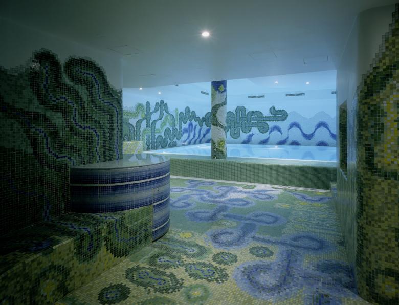 Im Untergeschoß bietet sich im renovierten Hallenbad samt Saunabad ein markantes Erlebnis unbekümmerter 1960er Ästhetik. Bunte Fliesen in ondulierend –floralem Dekor treffen damals wie heute den Zeitgeist perfekt – sie mussten nur eine wenig renoviert und mit Installationen in heutige Hygienestandards ergänzt werden. Tief unten gibt es – für diverse Eventnutzungen – auch noch alte Bierkeller von einer ehemals ansässigen Brauerei. Ein eigener Weinkeller für jede Wohnung und ein Freibad unter alten Linden im rückseitigen Hangbereich der Anlage komplettieren die Ausstattung.