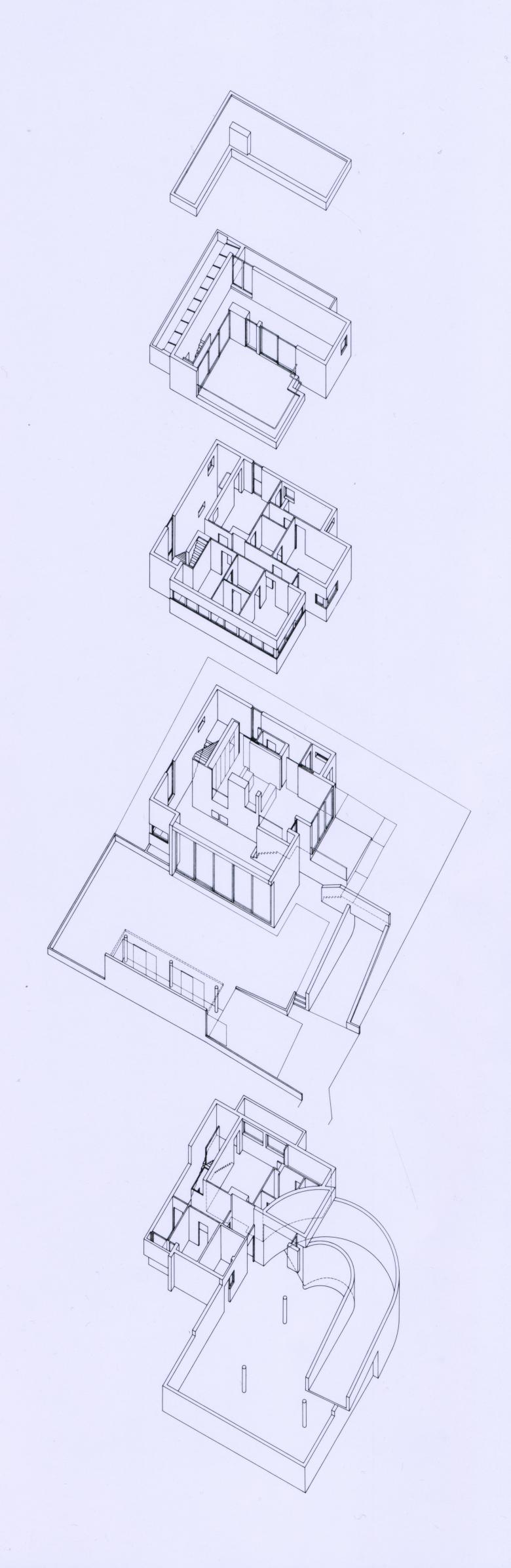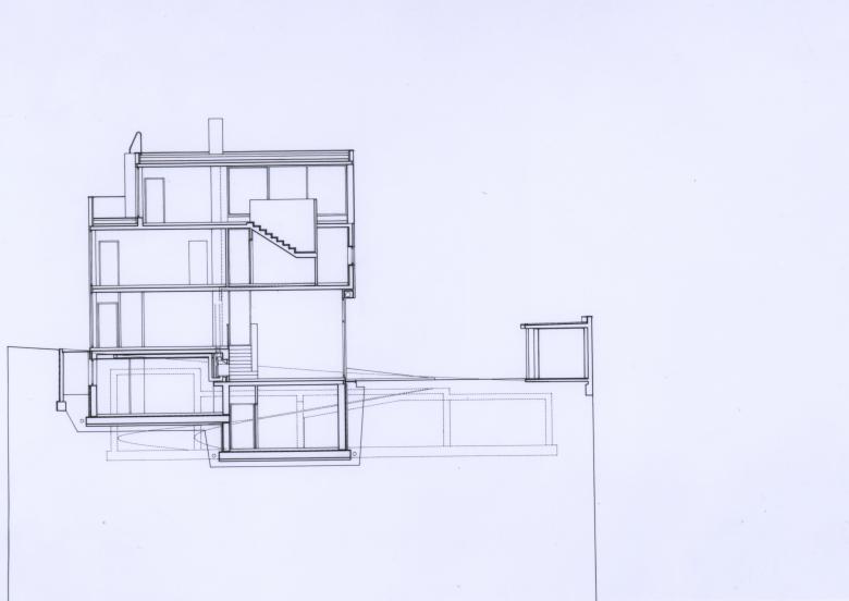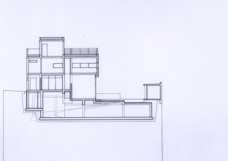 Innenräumlich ist im EG eine loftartige maximale Ausnutzung des Raumes beabsichtigt, wobei ein zusätzliches räumliches Erlebnis durch die Ausbildung einer 2. Ebene entsteht, welche in den Hang geschnitten ist.