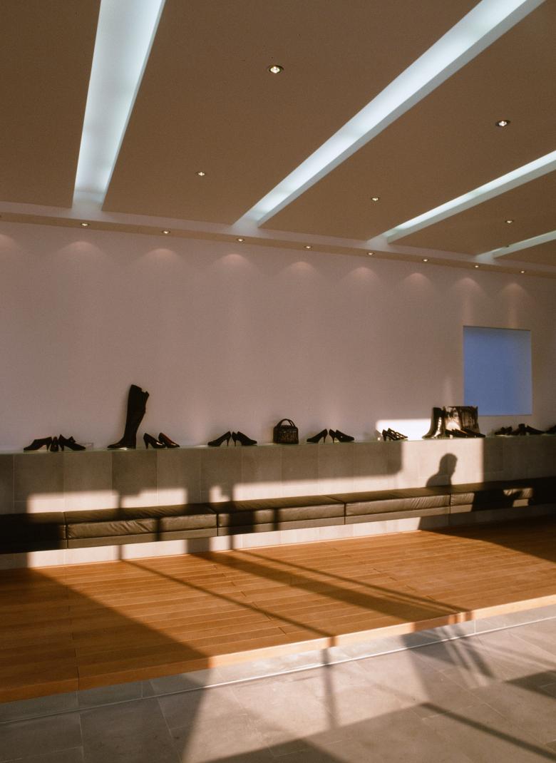 Beabsichtigt war eine puristische, kontemplative Atmosphäre die dem Schuh als Objekt genügend Raum und Aufmerksamkeit lässt.