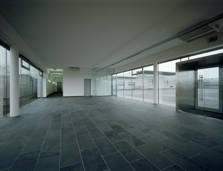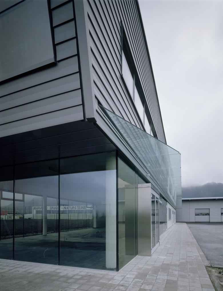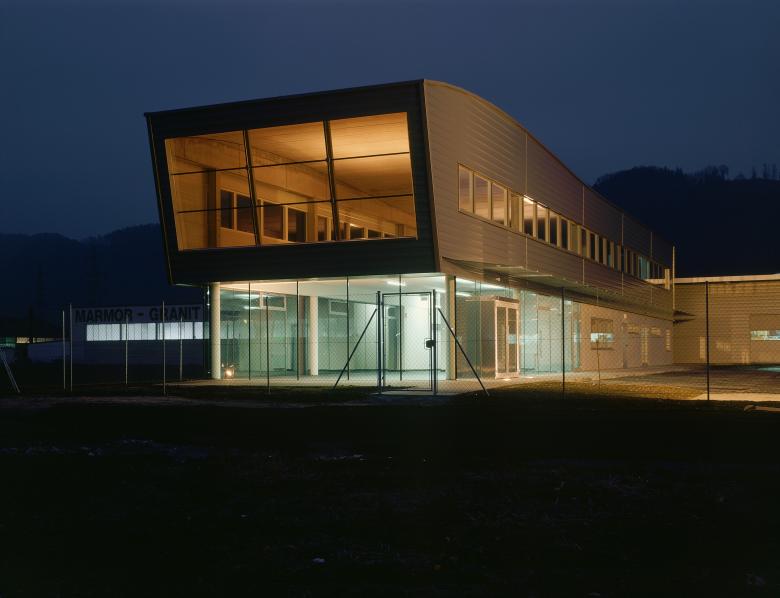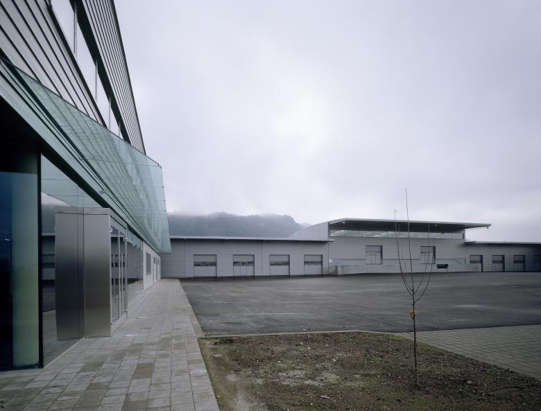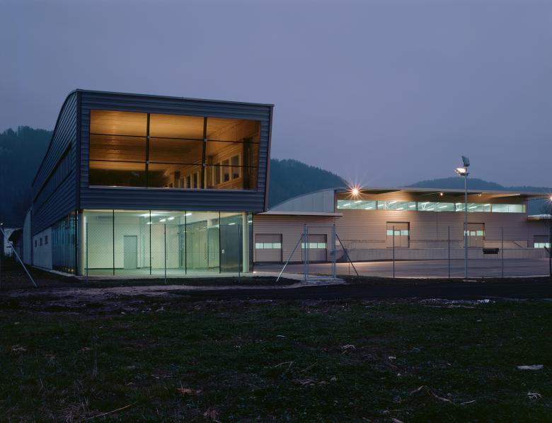 Das zentrale Verwaltungsbüro ist vollflächig verglast und steht in einem Dialog mit der Umwelt, es befindet sich als autonomes Kopfgebäude am Rand der der Betriebsanlage.