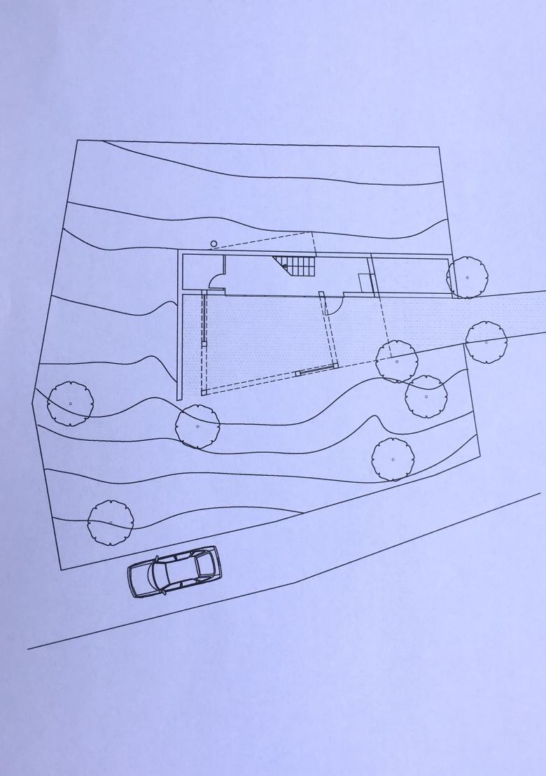 Als Grundstück fand sich ein steiler, dicht von Bäumen bestandener Nordhang, für den der Bauherr einen Entwurf eines eingeschossigen, nordorientierten Hauses mit Flachdach hatte.