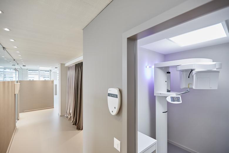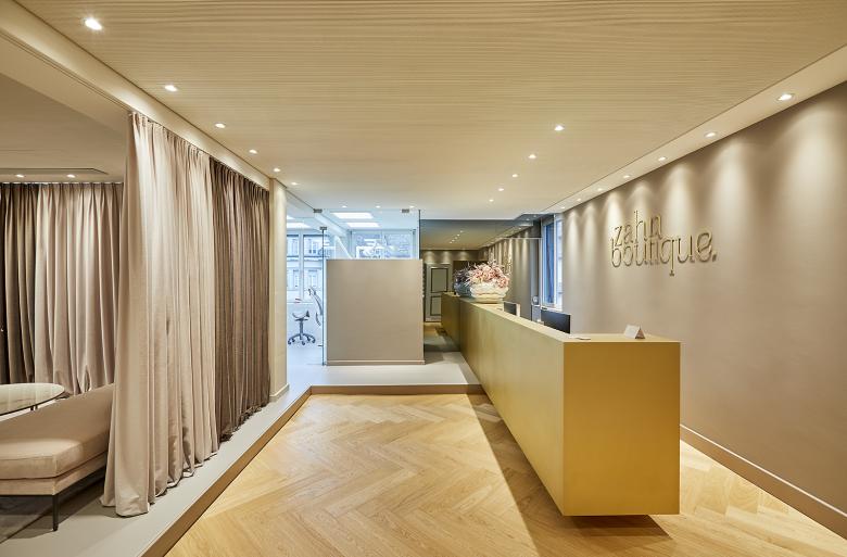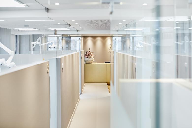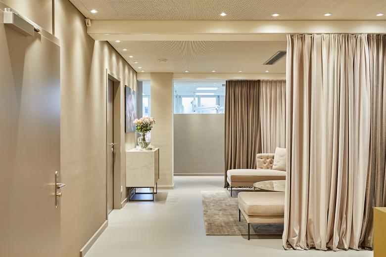 Die Praxis besticht durch das warme Entrée im Boutique – Charakter. Der loungige Wartebereich mit Wohnzimmercharakter liegt im Zentrum und kontrastiert mit der klaren und reinen Architektur der Behandlungsräume, die sich auch auf einem erhöhten Niveau befinden.