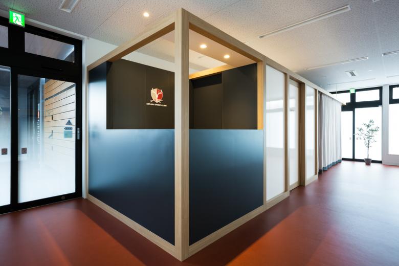 In addition, the team colors ``Antlers Red, Flaxen, and Black'' were used to finish the main elements such as floors, partitions, fabrics, and reception counters.