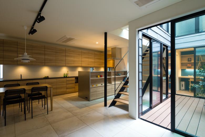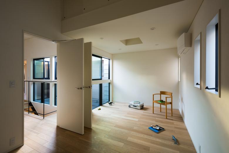 The exterior walls of the house are placed to the full extent of the site conditions, and a courtyard with a deck terrace is placed in the center of the wall, so that light and wind can be felt from anywhere in the deep interior space, and the ground floor has a flat access to the courtyard terrace. The courtyard terrace provides a good diagonal view and airy space, and at times creates a good distance between the family members across the courtyard terrace, a relationship that is important to each family member, and an expanse of space that is larger than the numerical value.