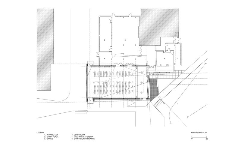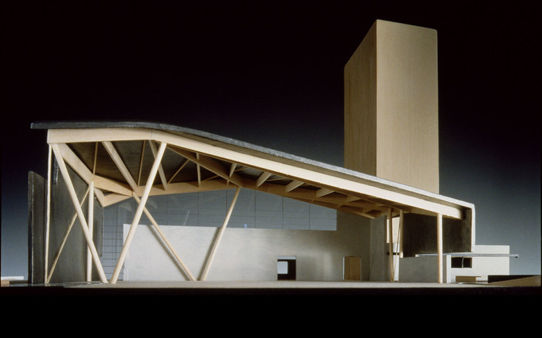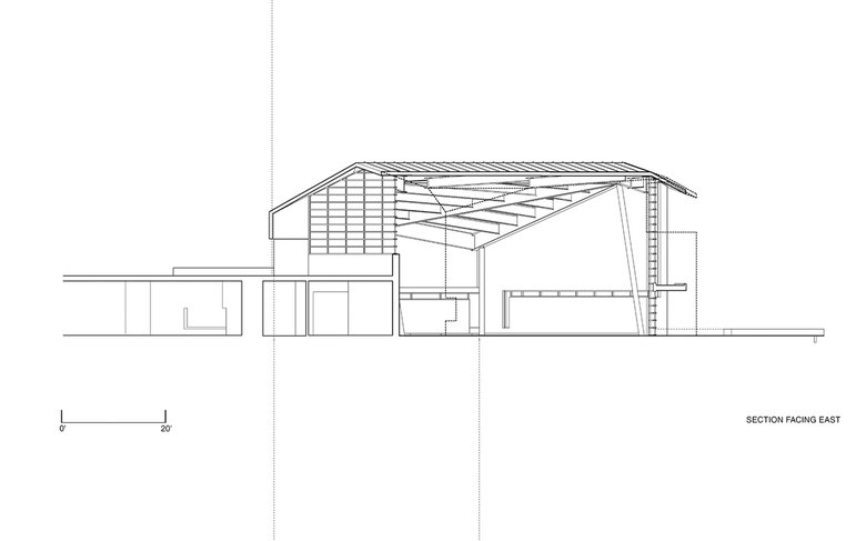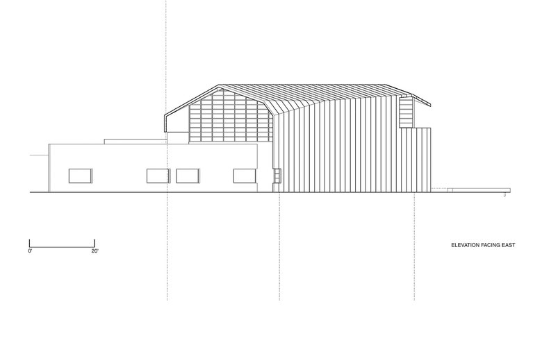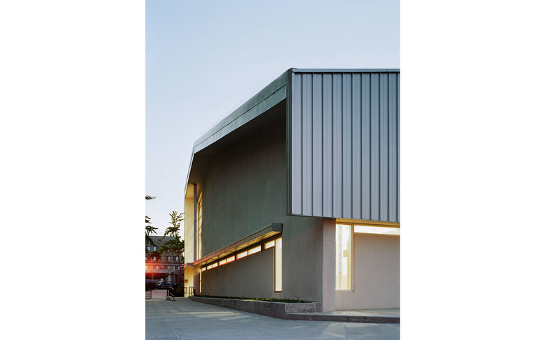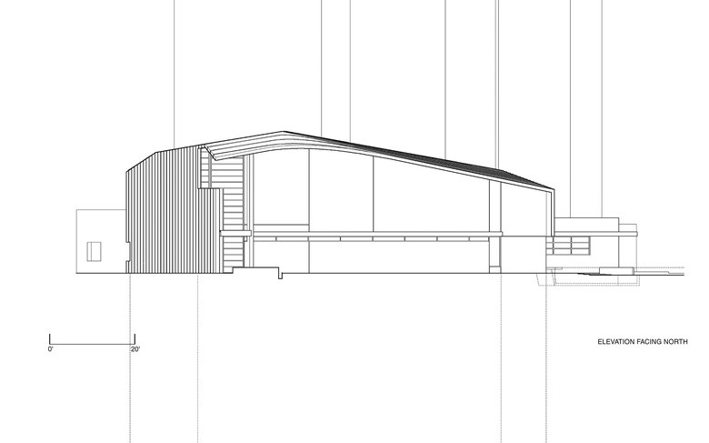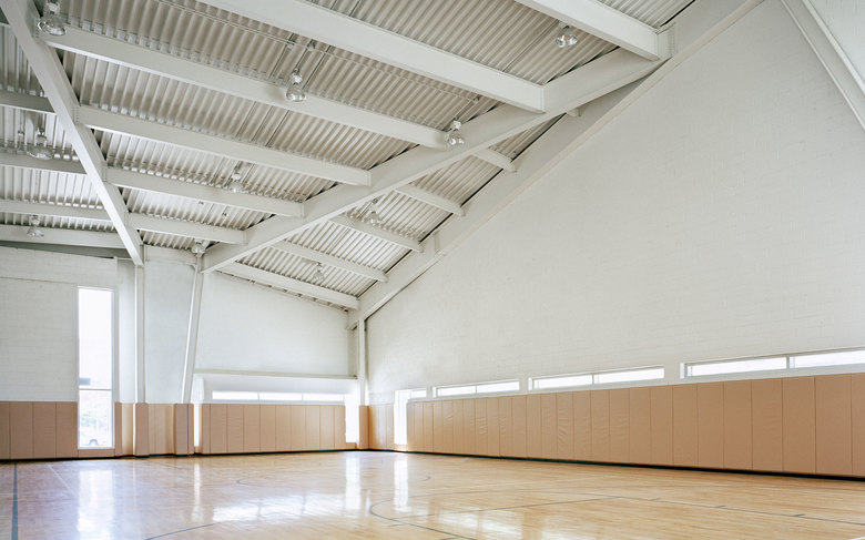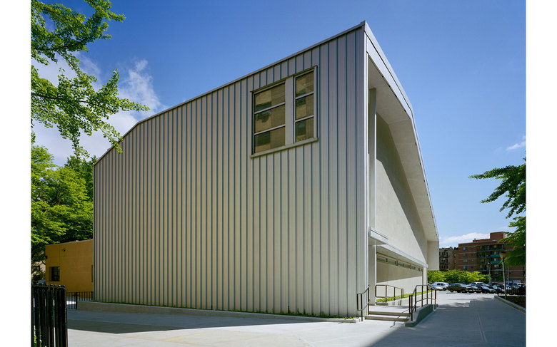 WaveLine is a steel and masonry pavilion of subtle but powerful vision, with modest dimensions. The building is located in Queens. WaveLine does not try to blend in with its neighbors — twenty-story public housing towers built during the 1950’s — but instead uses the contrast of contemporary materials and graceful form to define a place for performance and sport within an existing public housing complex. WaveLine’s main facade is the building’s bent roof plane built with standing-seam galvanized steel and aluminum. The interior is a simple, white, one-room volume for performance and sport. The pavilion ceiling is a faceted surface expressive of the overall form of the building’s exterior. A new entrance vestibule on the south elevation of the existing community center is the lobby for the new pavilion. WaveLine, a term from ship-building and physics, refers to a shape able to move through water without resistance. Acoustic sound calculations of reverberation times also influenced the building shape.
