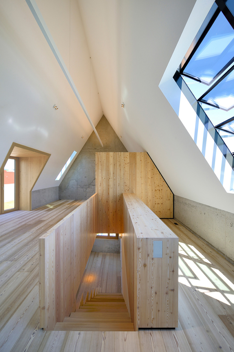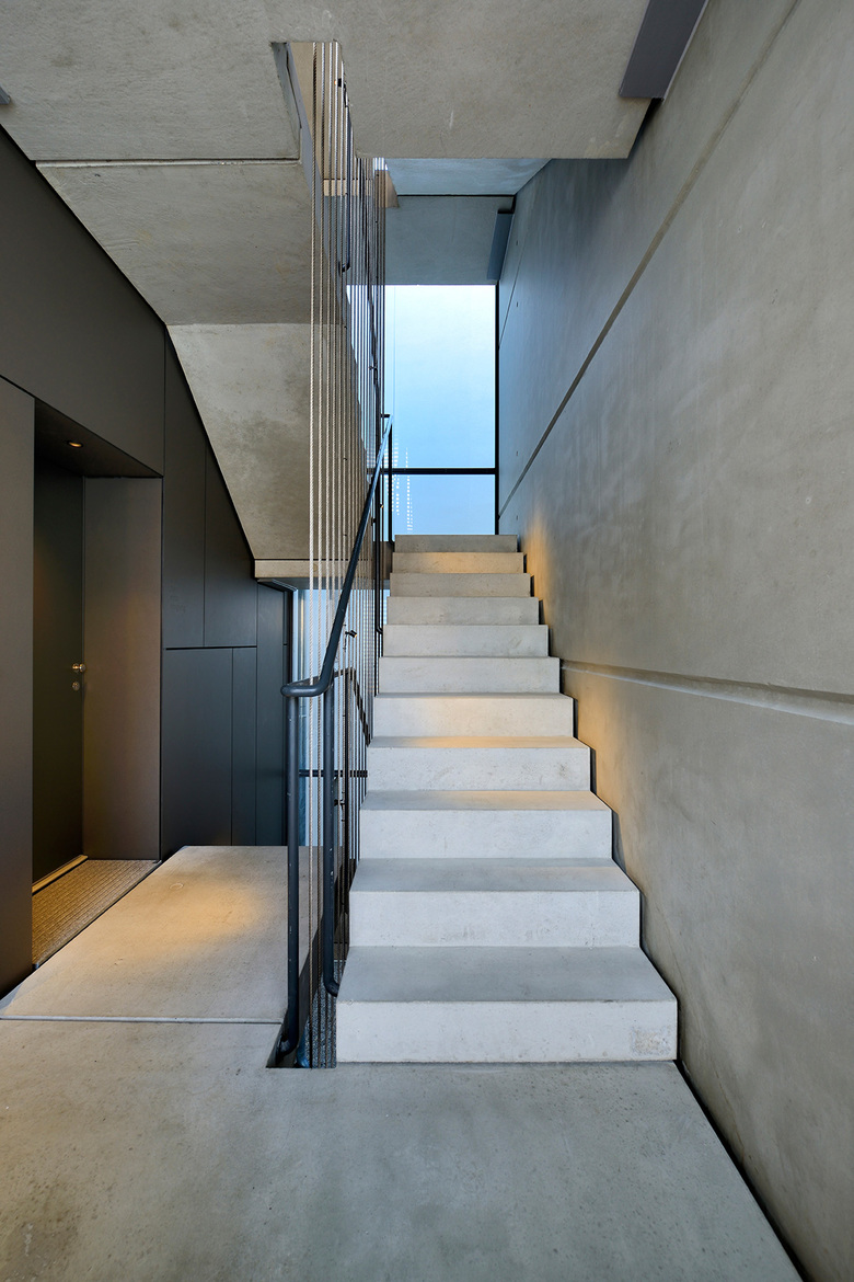 entwurflicher grundgedanke war, eine neue urbane identität zu schaffen und den angrenzenden stadtraum aufzuwerten und zu beleben. der typus des innenstadtprägenden, mittelalterlichen giebelhauses wurde als sichtbetonmonolith interpretiert. erstmalig in deutschland wurde in der karpfengasse eine konstruktion aus kerngedämmtem dämmbeton in zweischaliger bauweise monolithisch gegossen, die sowohl höchste energie- als auch konstruktionsstandards erfüllt. die bisher nur in der schweiz erprobte bauweise wurde gemeinsam mit der schweizer MISAPOR AG auf das deutsche bauwesen übertragen.außen wie innen entstanden charakteristisch lebendige sichtbetonflächen. im kontrast dazu stehen die unbehandelten vollholzfenster aus lärche und die organisch geformte eingangsfassade aus metalllamellen. die erdgeschossnutzung als café-bar belebt durch die raumhohen fenstertüren den angrenzenden stadtraum und bespielt die umgebenden freiflächen. im ersten und zweiten obergeschoss befinden sich die büroräume eines architekturbüros, im dritten obergeschoss eine maisonettwohnung mit dachterrassen und münsterblick.